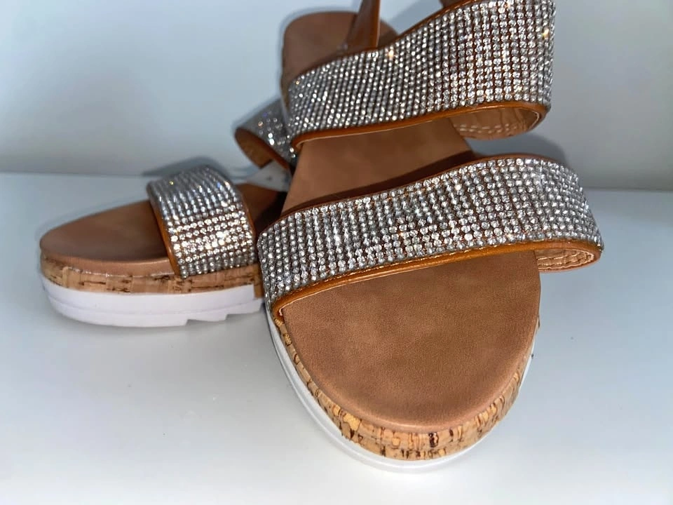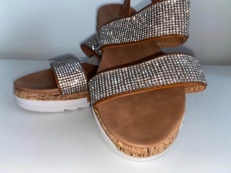 Gorgeous Tahari rhinestone platform sandals — brand new with tags. Super sparkly straps, comfy cushioned footbed, and a cork-style platform sole. Perfect for summer, events, parties, or adding a little glam to any outfit.