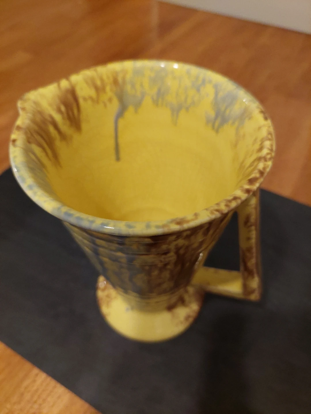 This is a vintage New England Pottery pitcher in a yellow and brown drip glaze. It is in good condition with some crazing in the glaze, which is common for items of this age. It would be a great addition to any collection or a unique piece to use in your home!