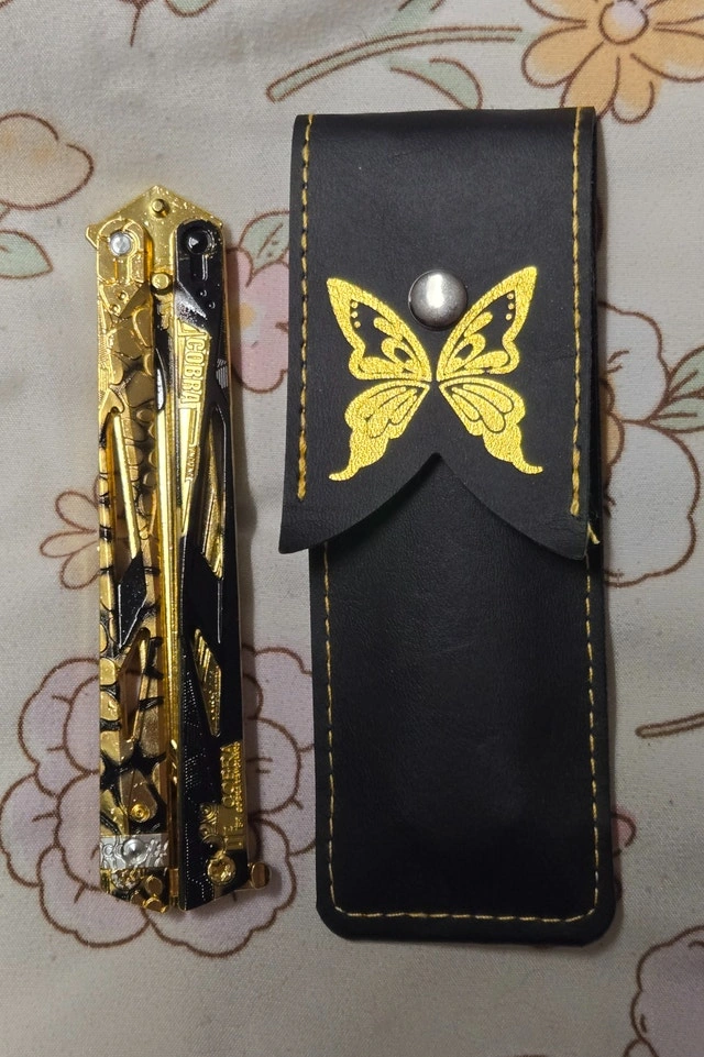This eye-catching pair of collectible knives includes a uniquely shaped folding knife and a golden balisong (butterfly knife), both inspired by game character weapon designs. These are not real steel knives, making them perfect for cosplay, display, or collectors who love fantasy-style gear. The set includes a black faux leather sheath with a butterfly design, adding a nice touch for storage or gifting. $5 each.