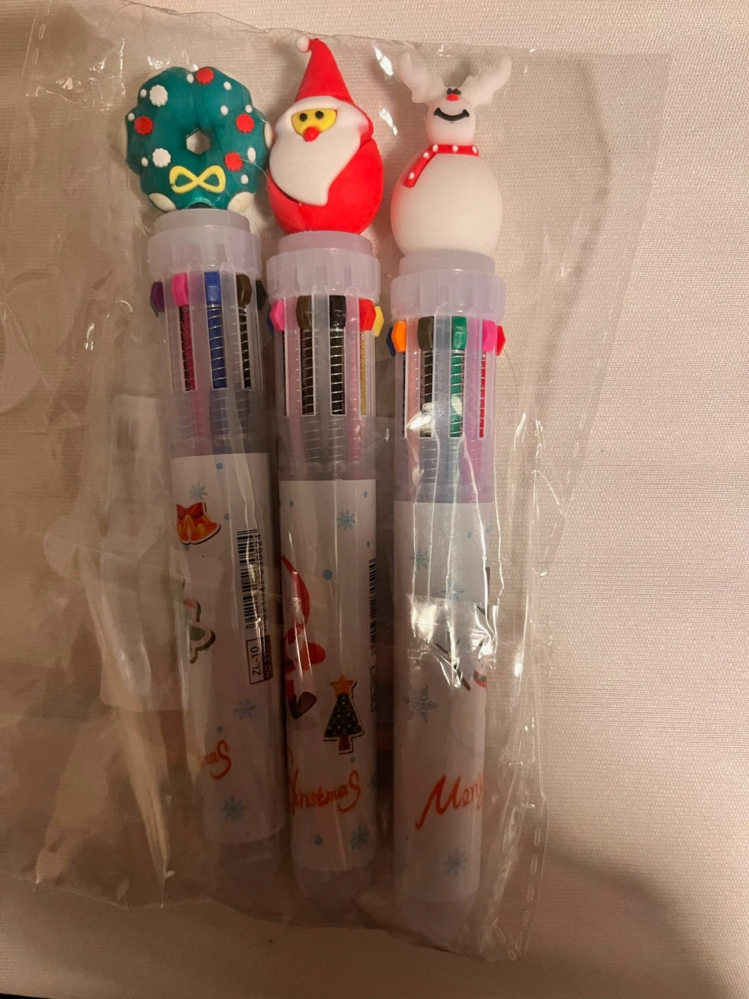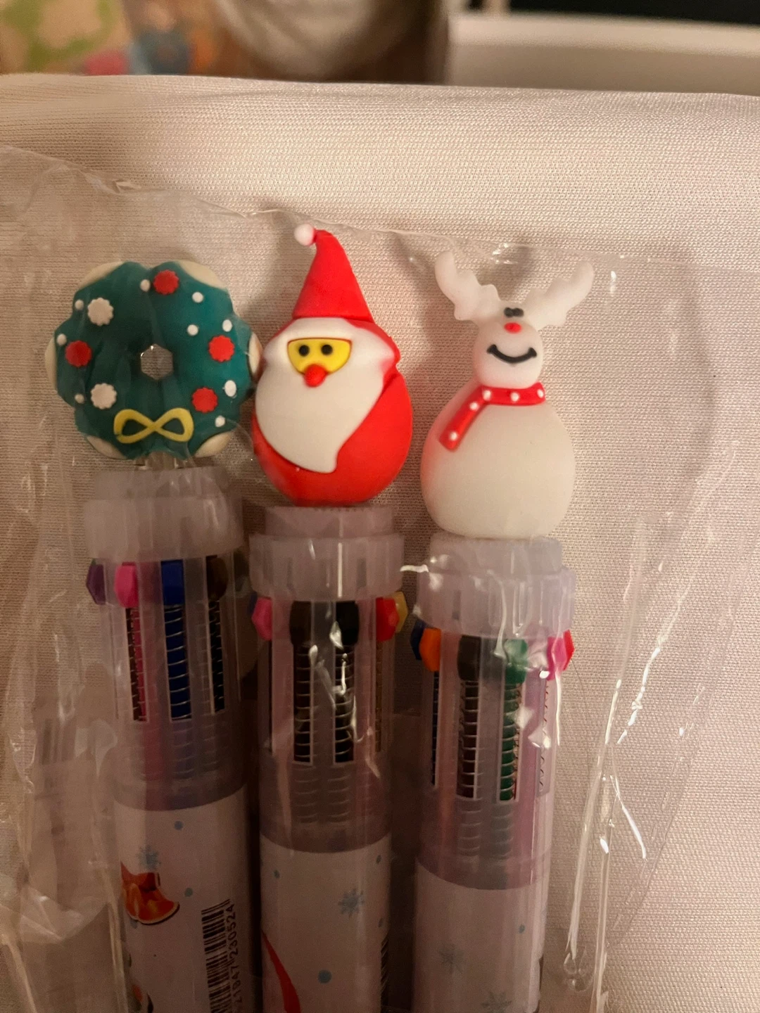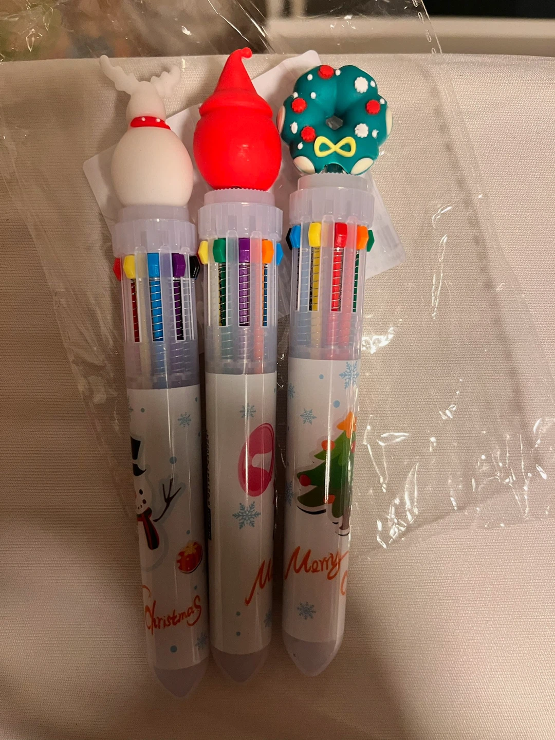 Here's a set of three Christmas-themed multi-color pens! Each pen has a different topper: a wreath, Santa, and a reindeer. They're perfect for adding some festive cheer to your writing or drawing