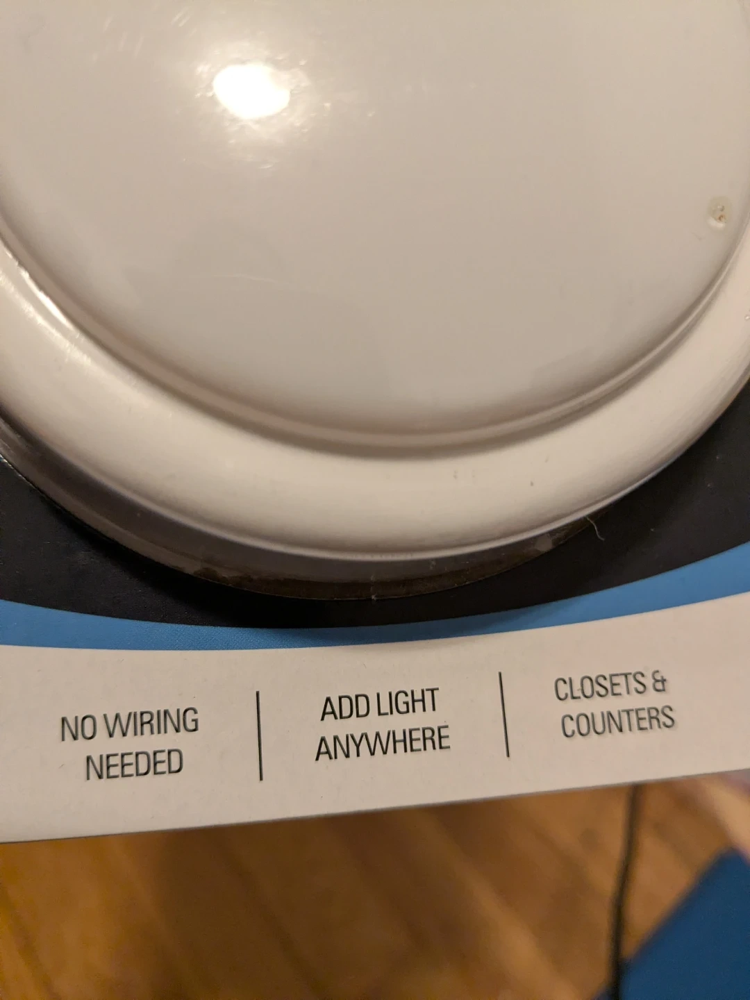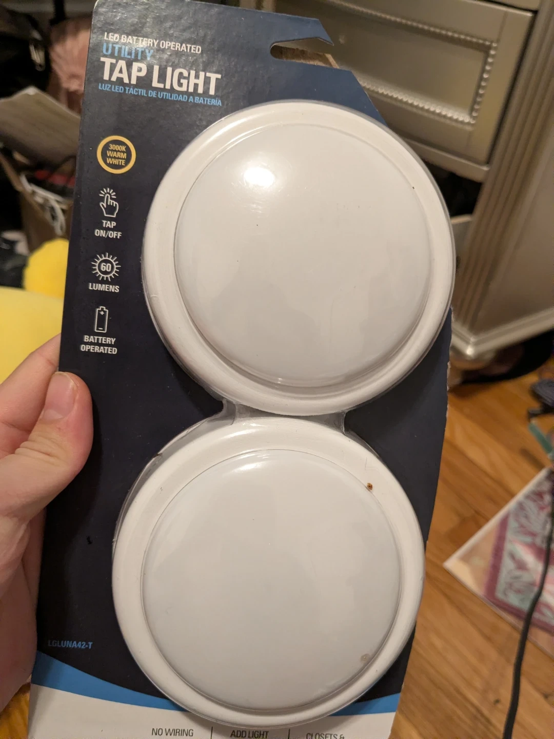I'm selling a new LED battery-operated utility tap light. It's perfect for adding light anywhere, especially in closets and counters. No wiring needed. It provides 3000K warm white light and operates at 60 lumens. It's battery operated for easy use