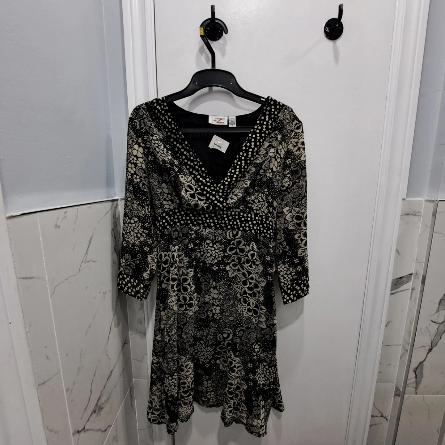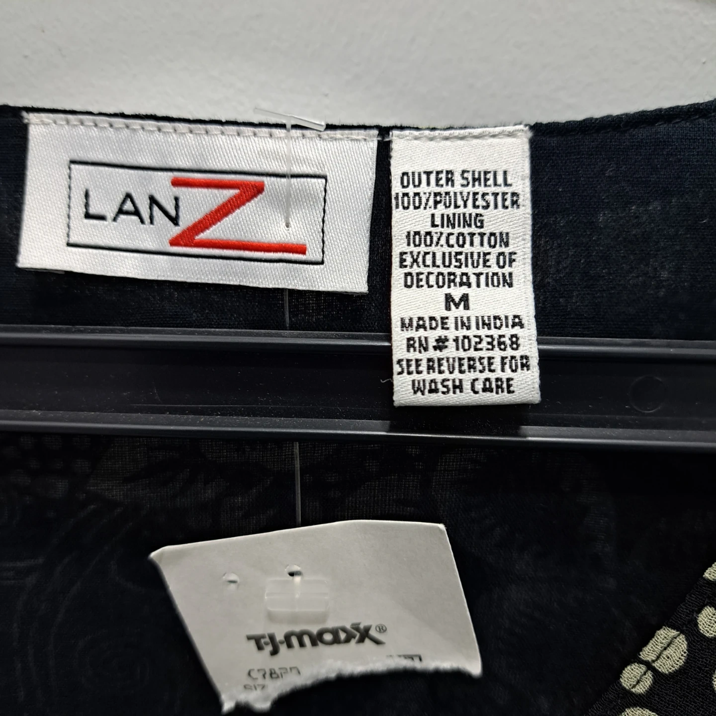 Selling a Lanz dress in size medium! It's a lovely black dress with a floral pattern. The outer shell is 100% polyester, and the lining is 100% cotton.