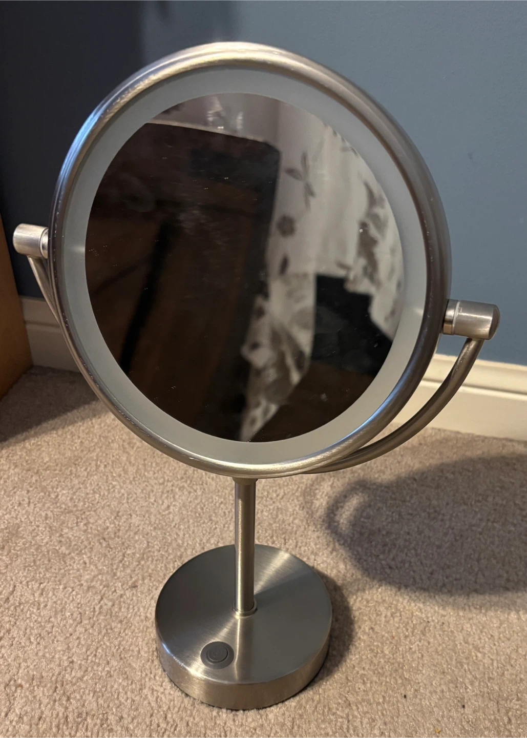 Here's a lighted vanity makeup mirror (8” diameter)! It's in great condition and perfect dressing table addition. It provides great lighting for makeup application and skincare routines. #Cleanout
