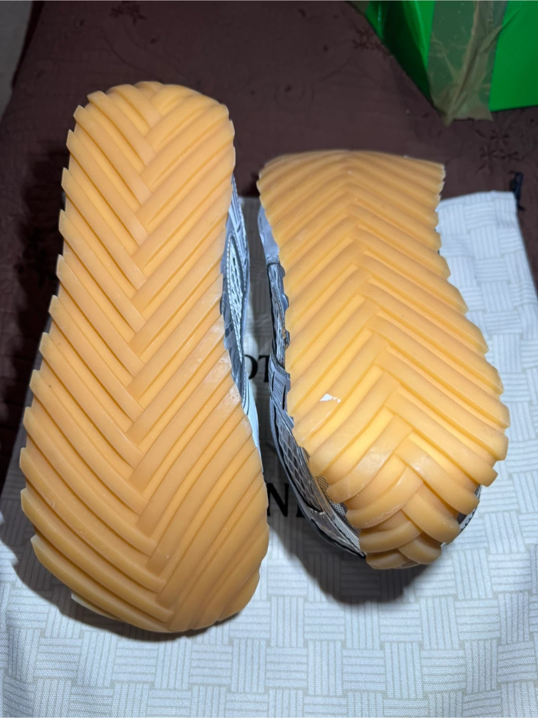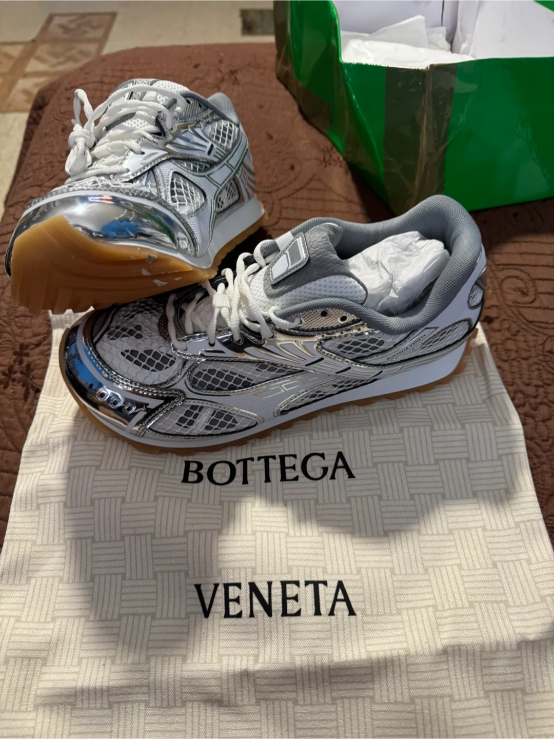 Selling a pair of Bottega Veneta Orbit Sneakers in silver! They are a size 45. These sneakers come with the original box and dust bag. The soles are a gum color. But the is damage or broken