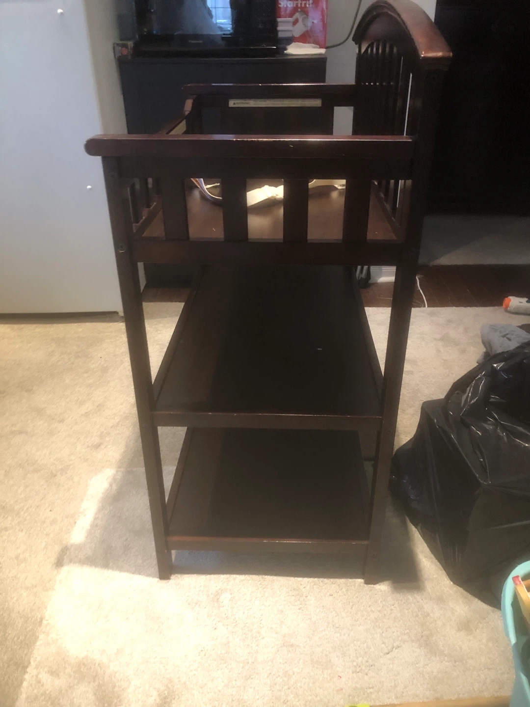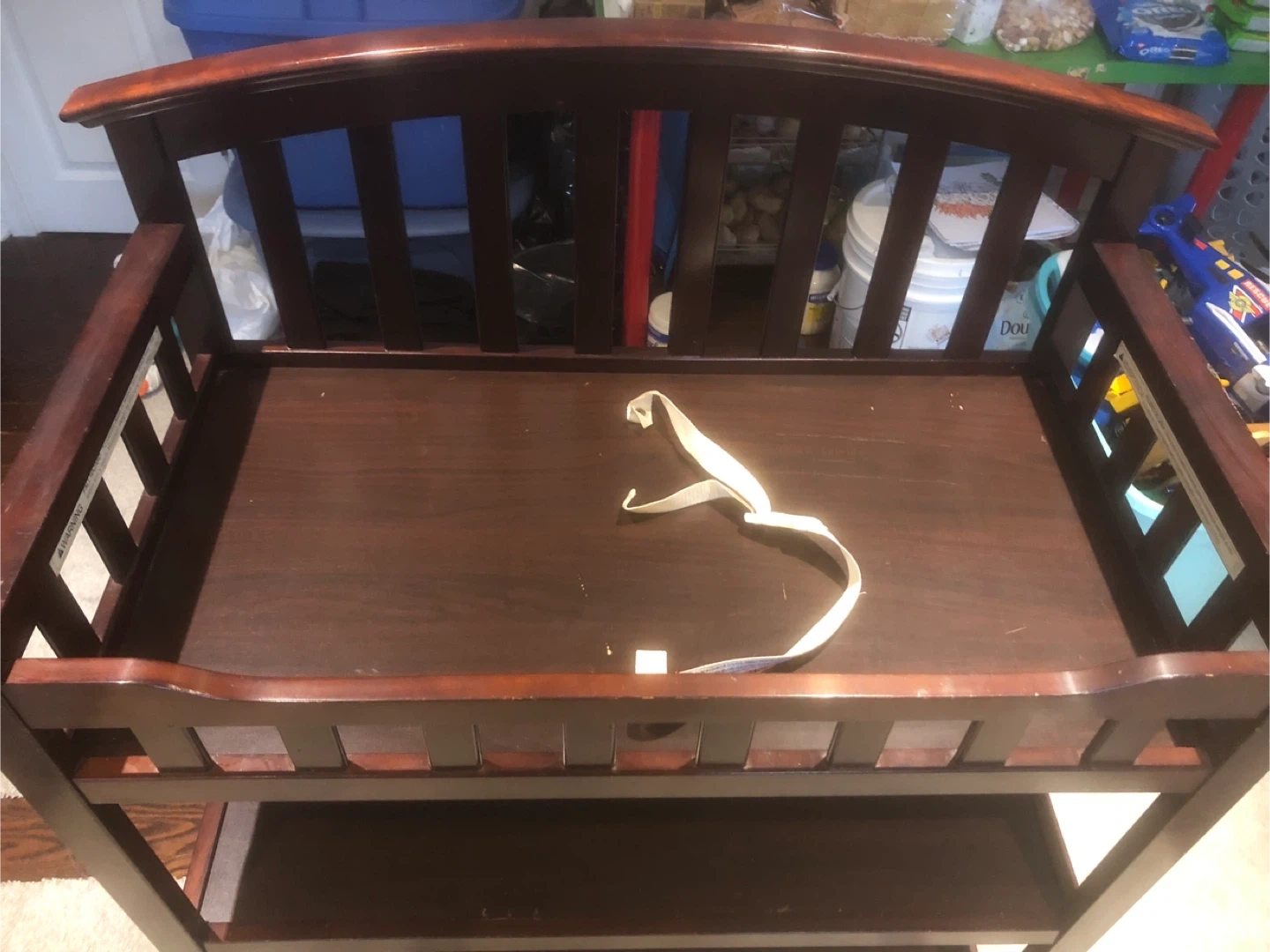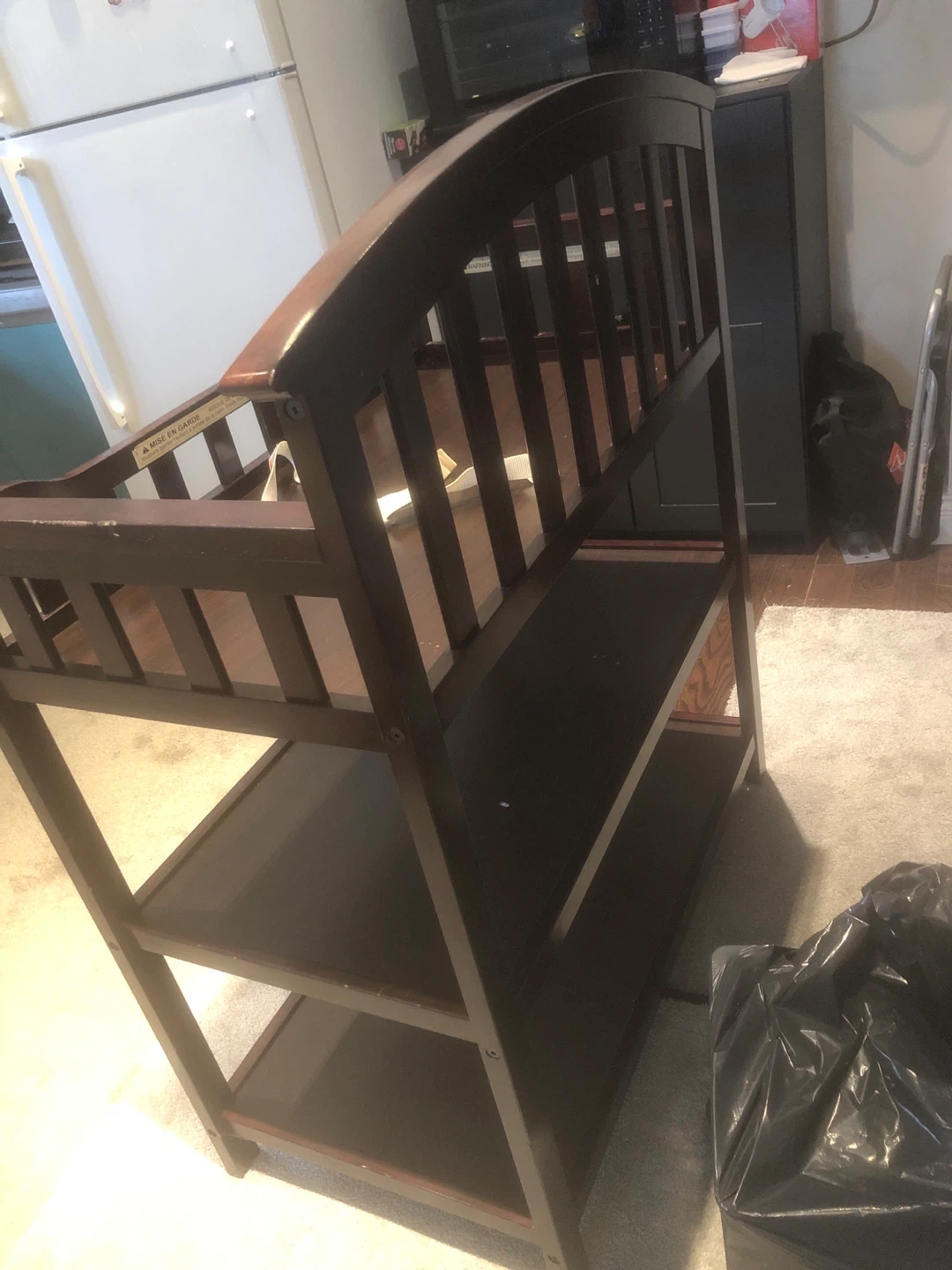 Selling a Graco changing table in a dark wood finish. It has a sturdy design with multiple shelves for storage. Perfect for keeping baby essentials organized and within reach!