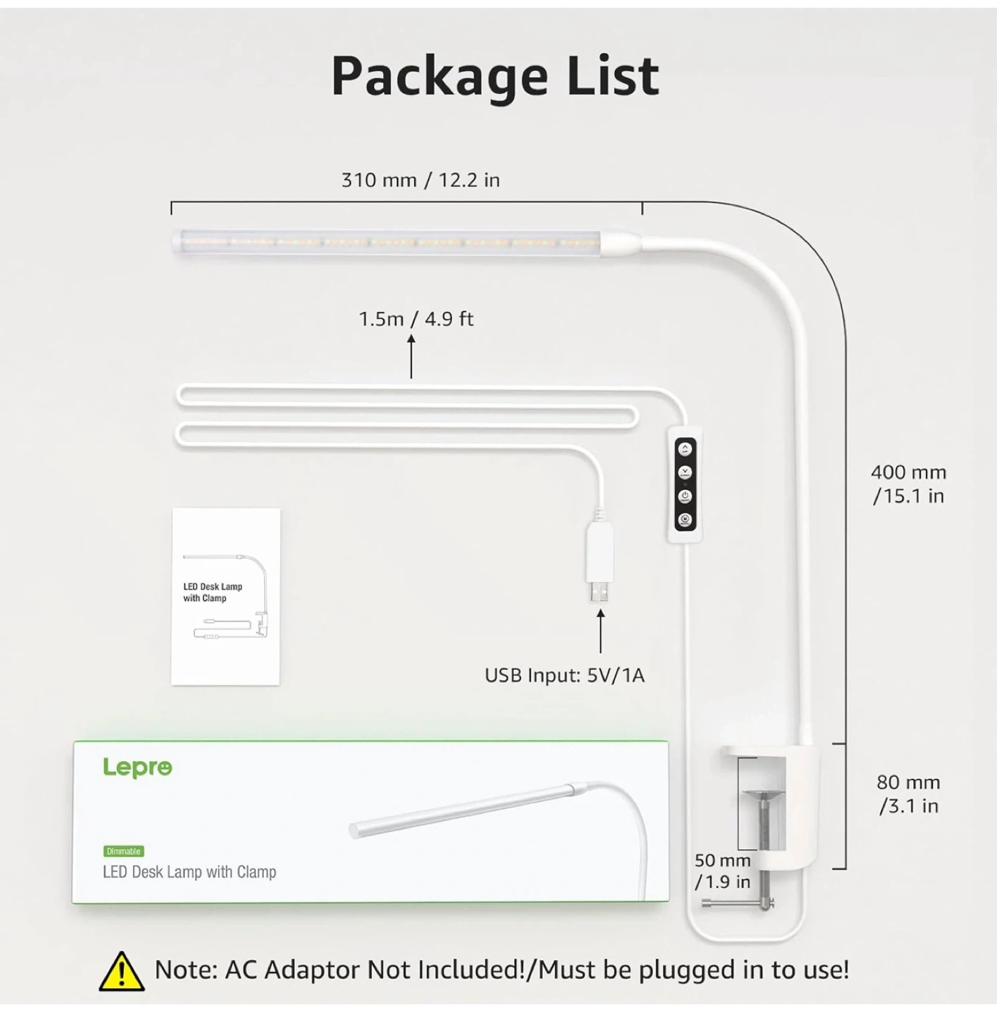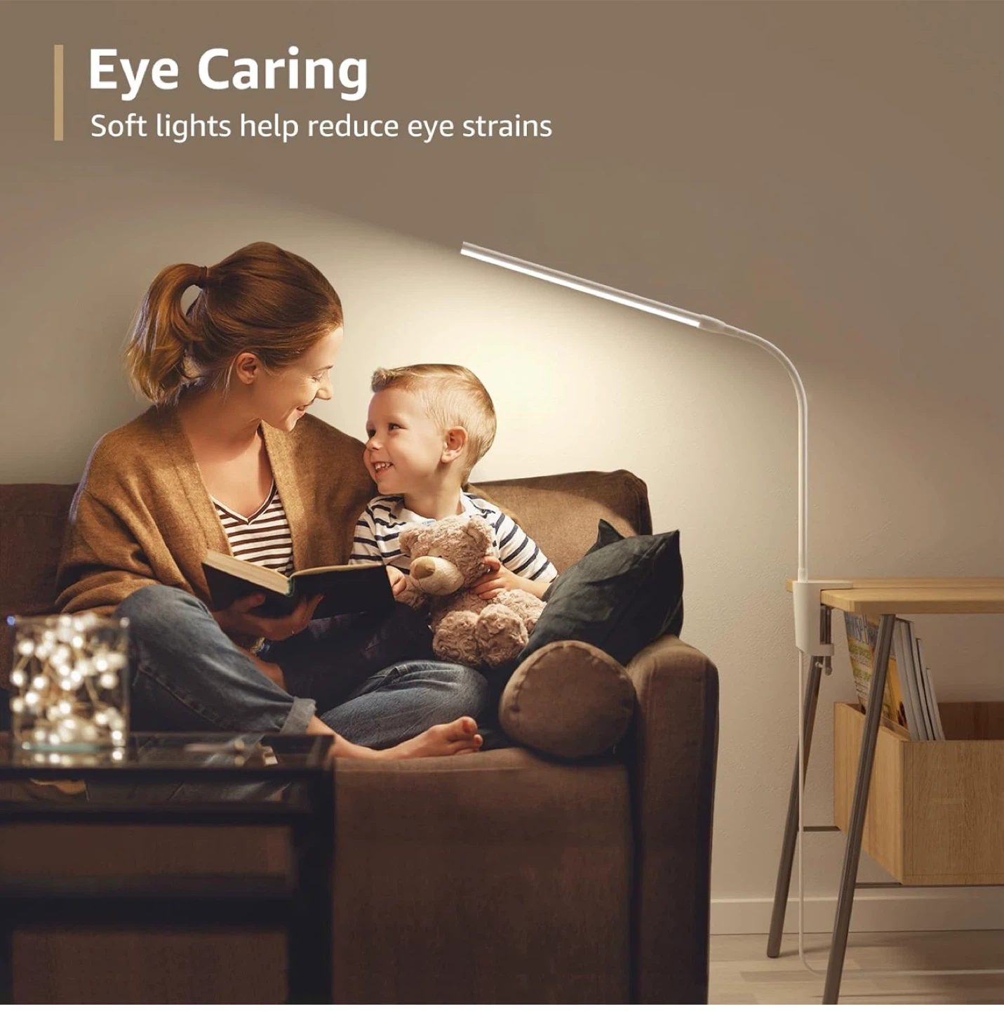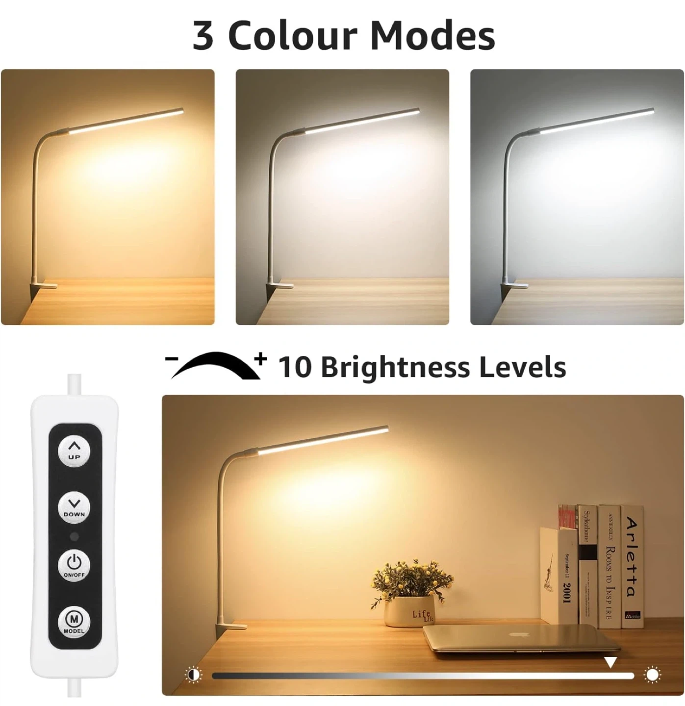 Lepro Desk Lamp with Clamp, LED Clip on Light, Dimmable Reading Light with 3 Color Modes 10 Brightness, Eye-Caring Flexible Gooseneck Table Lamp for Home Office, White