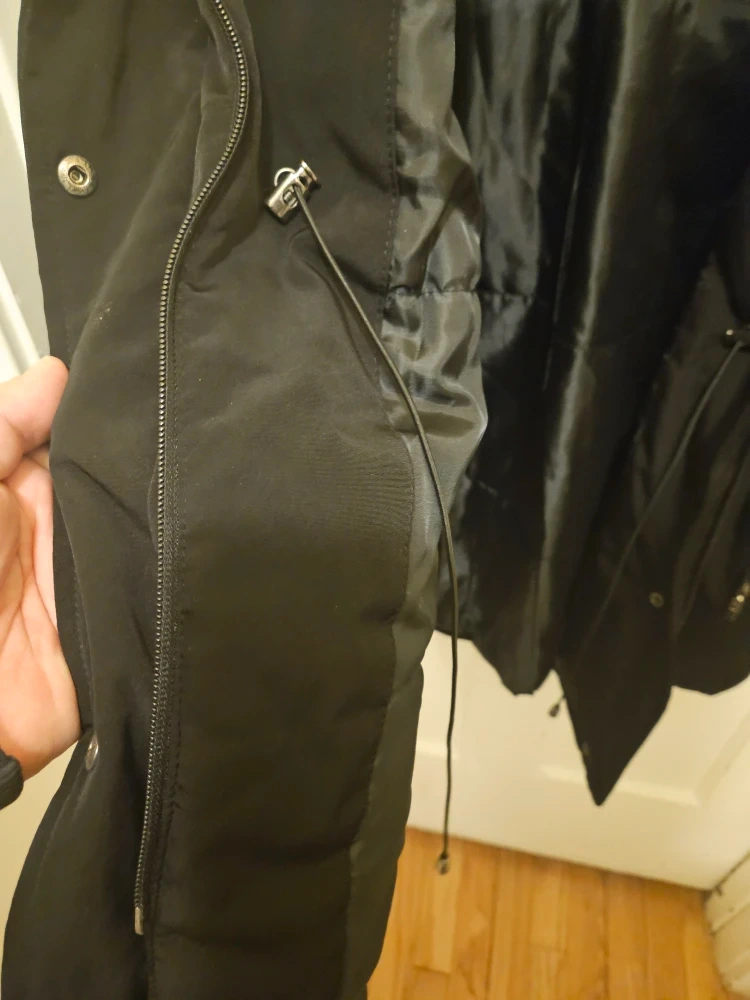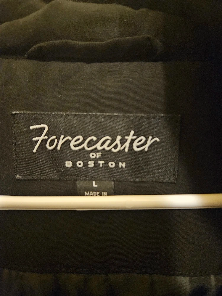 I'm selling a Forecaster of Boston winter coat in black. It's a size L and made with 100% polyester for the shell and lining. The fur face is 85% acrylic and 15% polyester, with 100% polyester for the fur back and filler insulation. Great for keeping warm this winter!