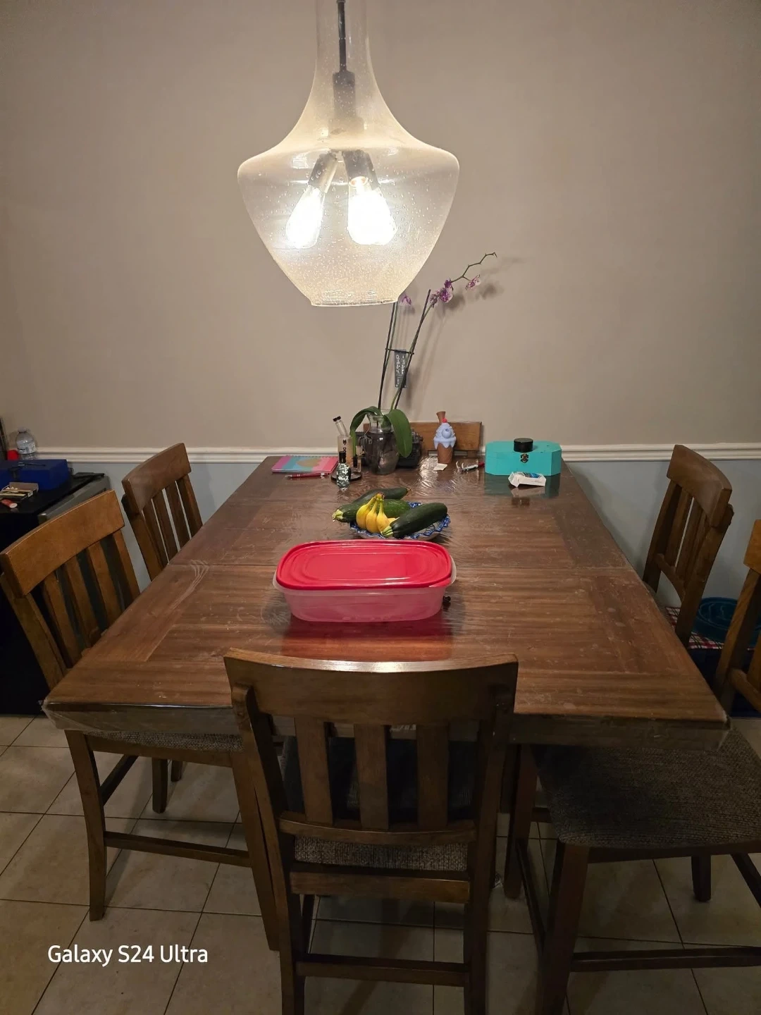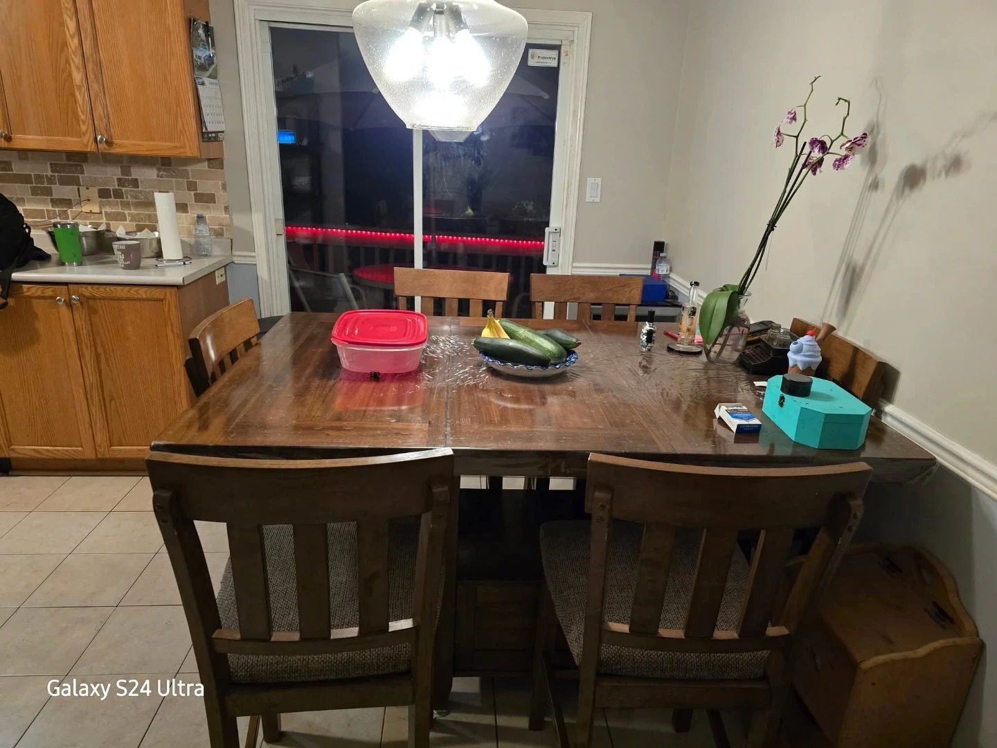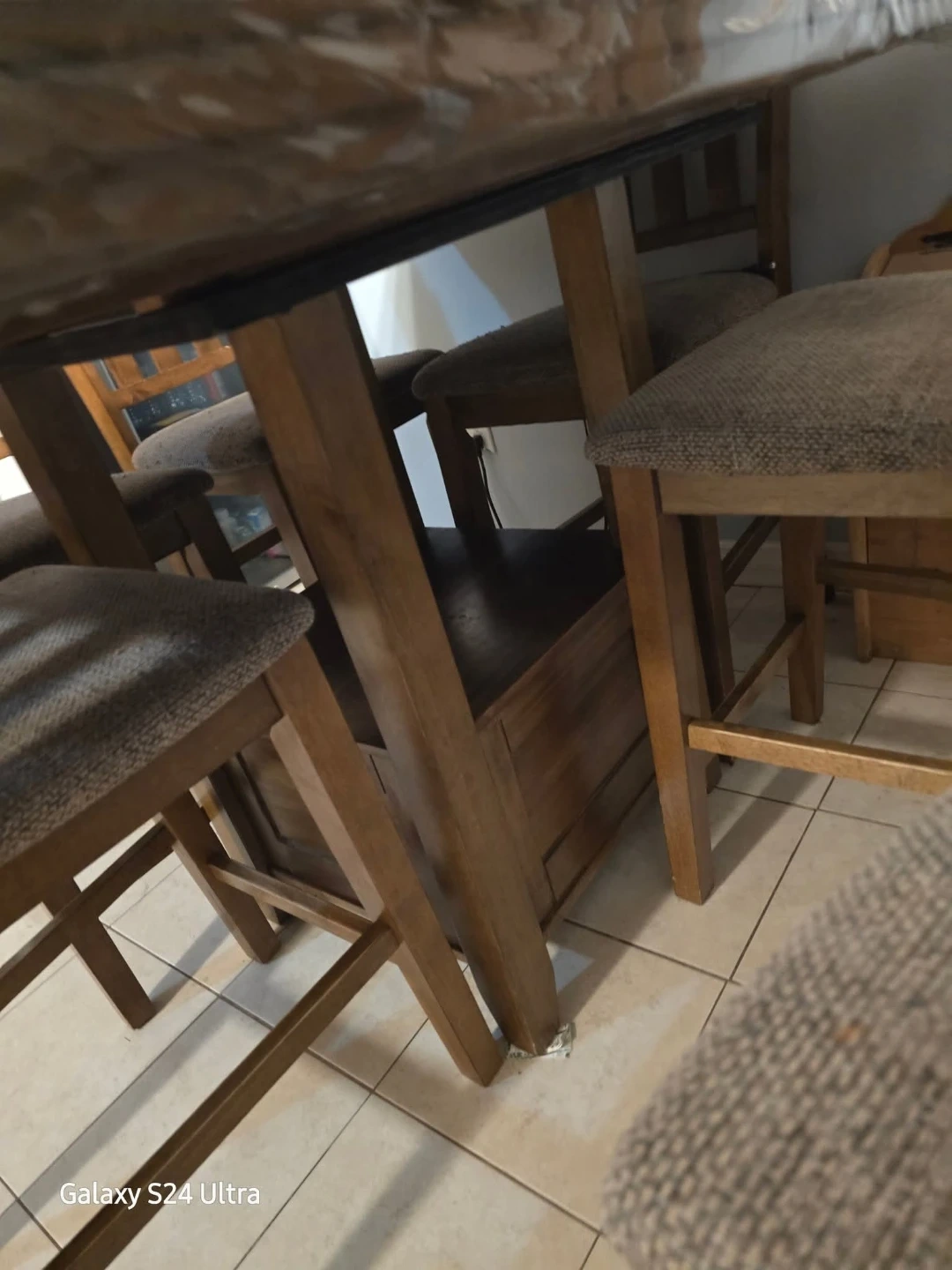 Selling a dining table with chairs. It's a wooden set with a rectangular table and six chairs with padded seats. The set is in good condition and perfect for a family dining area