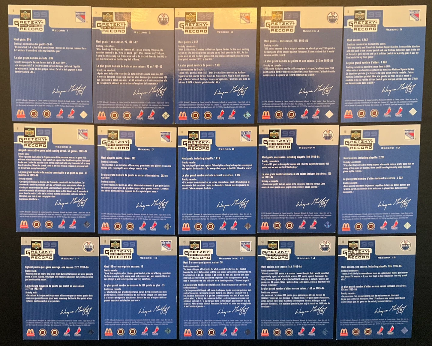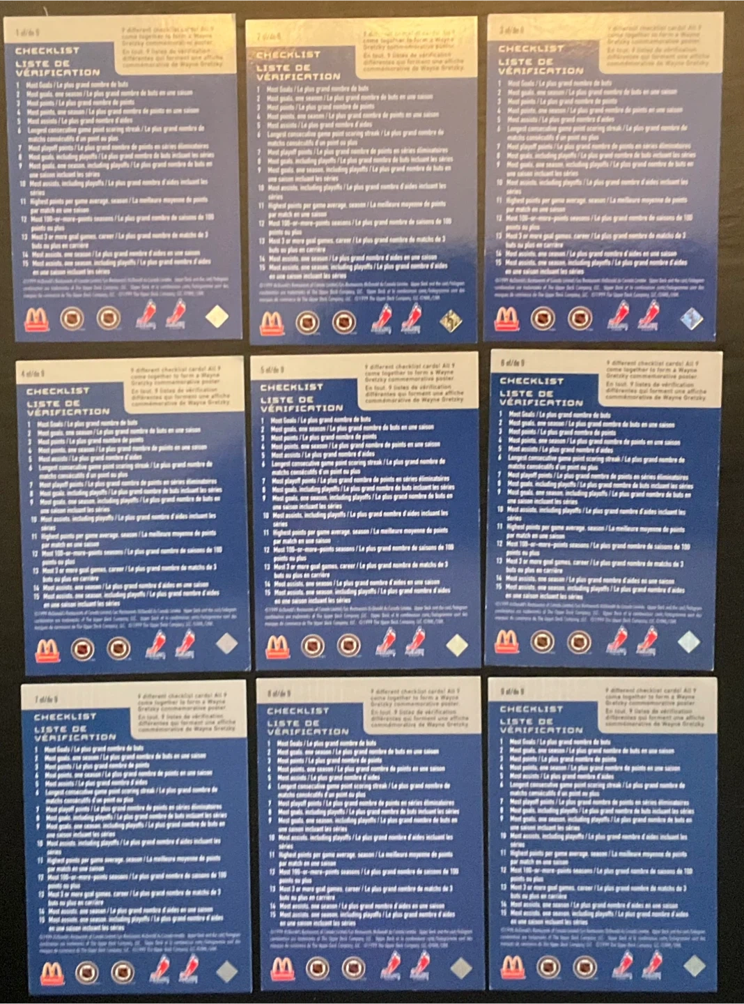 Selling a set of Wayne Gretzky Upper Deck record trading cards available through McDonald’s. These cards commemorate Gretzky's remarkable achievements in hockey. A great addition for any hockey fan or collector! Comes with the nine checklists that create a picture puzzle of The Great One.