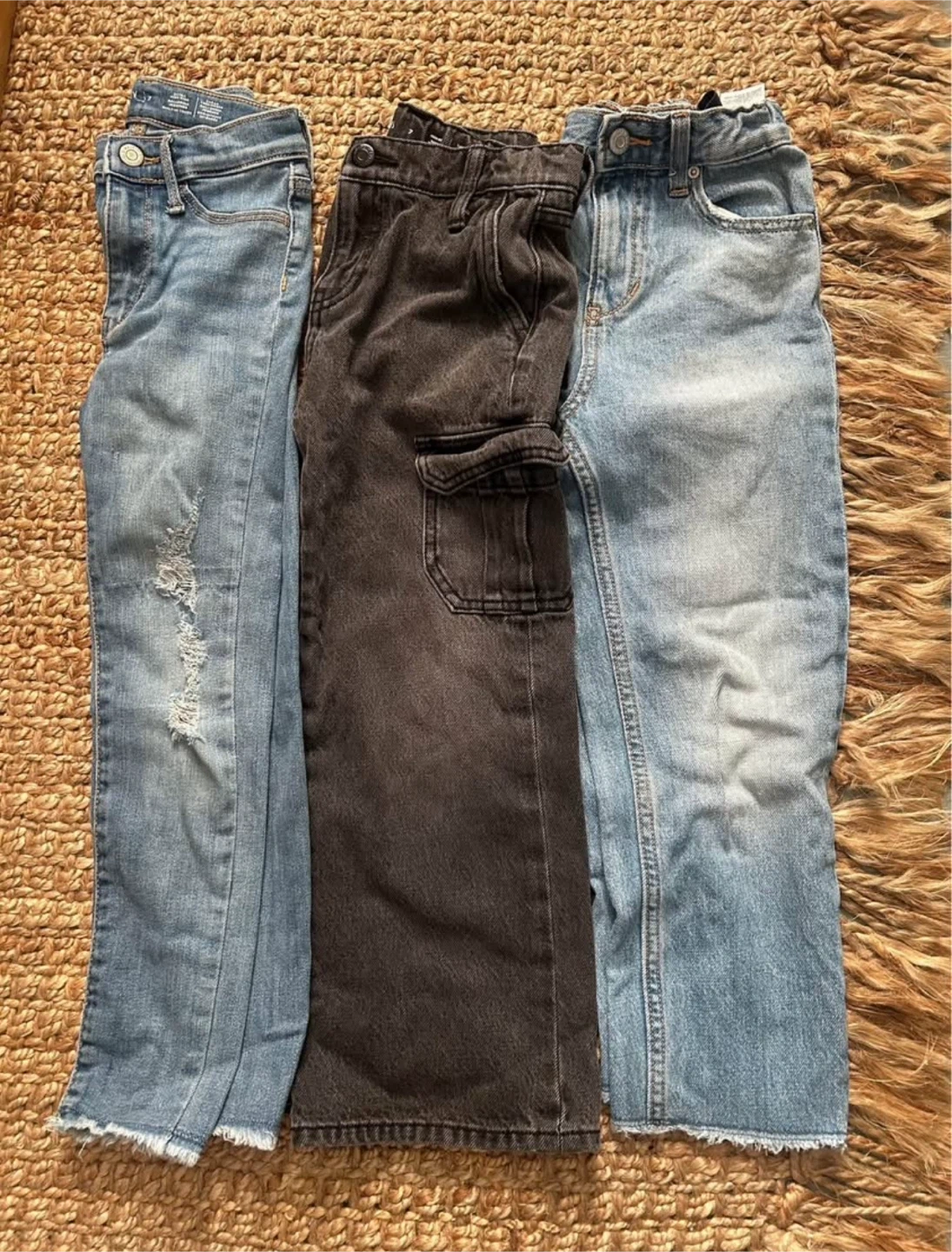 Selling a bundle of three pairs of kids' jeans! There's two pairs of light wash denim jeans and one pair of dark grey cargo jeans. All in good condition and ready for a new home!