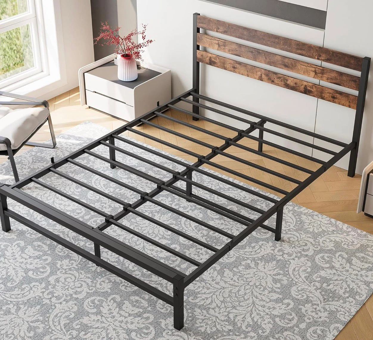 Queen Size Metal Bed Frame with Wooden Headboard