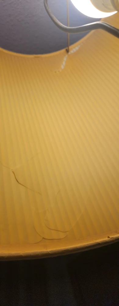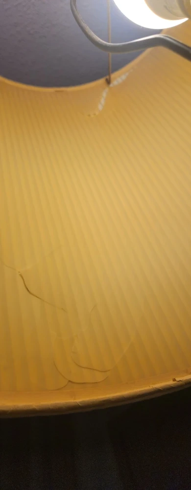 Selling a vintage table lamp with a gold-colored base and a pleated lampshade. The lampshade has some damage, as shown in the photos. It would be a great addition to any room with a vintage aesthetic!