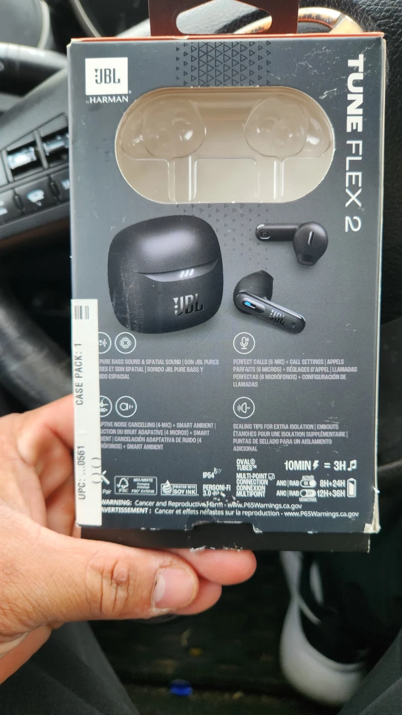 Selling a new pair of JBL Tune Flex 2 earbuds in black! They feature adaptive noise cancelling and spatial sound. The box is included and the expiration date is 2025 December 12. Perfect for calls!