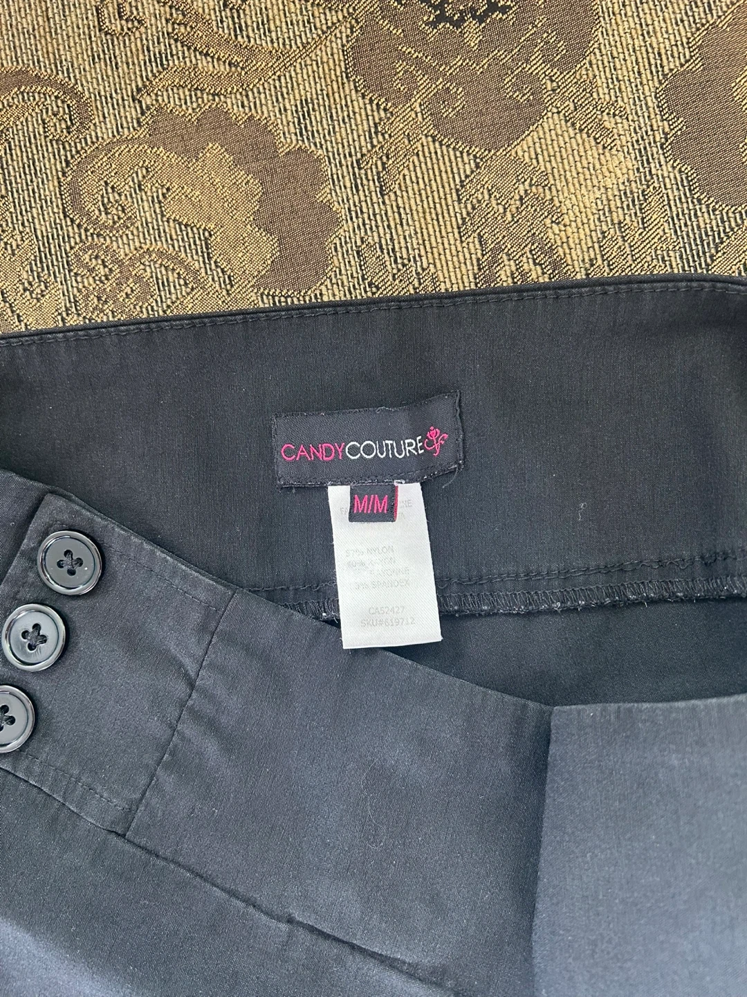 Selling a pair of Candy Couture black shorts in size medium. They feature a stylish design with button details. The material is a blend of 67% rayon, 29% nylon, and 4% spandex. Perfect for a casual outing!