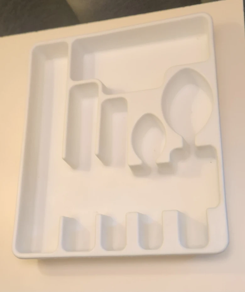 Declutter your drawers with this handy white plastic cutlery tray! It's in great shape and ready to organize your spoons, forks, and knives. Perfect for keeping your kitchen tidy and efficient