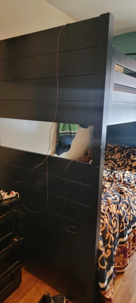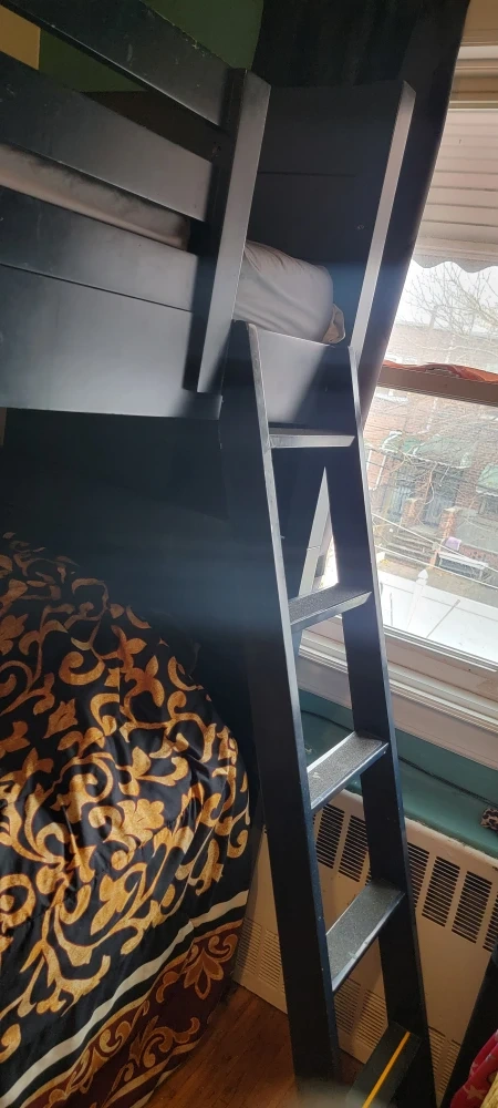 Selling a bunk bed frame in black! It comes with a ladder for easy access to the top bunk. The frame is sturdy and in good condition, ready for a new home. Perfect for saving space in a shared room or for kids' rooms