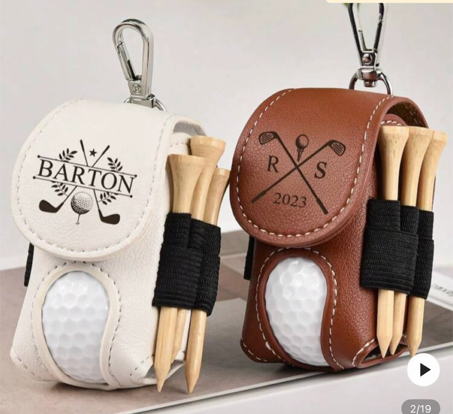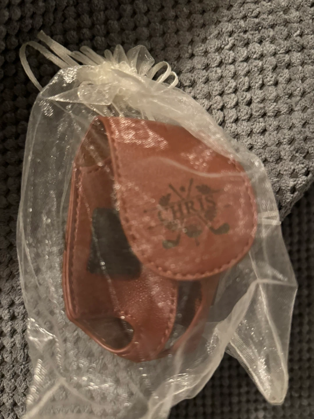 This is a brown leather golf ball holder that has been customized to the name CHRIS and makes the perfect stocking stuffer. It has a clip on the back so you can attach it to your golf bag or belt. It also has a loop to hold golf tees. It's in brand new great condition and ready for the golf course. I ordered one for Christmas and for some reason they sent me ten and would not refund the money. So now I have ten and I only need one.