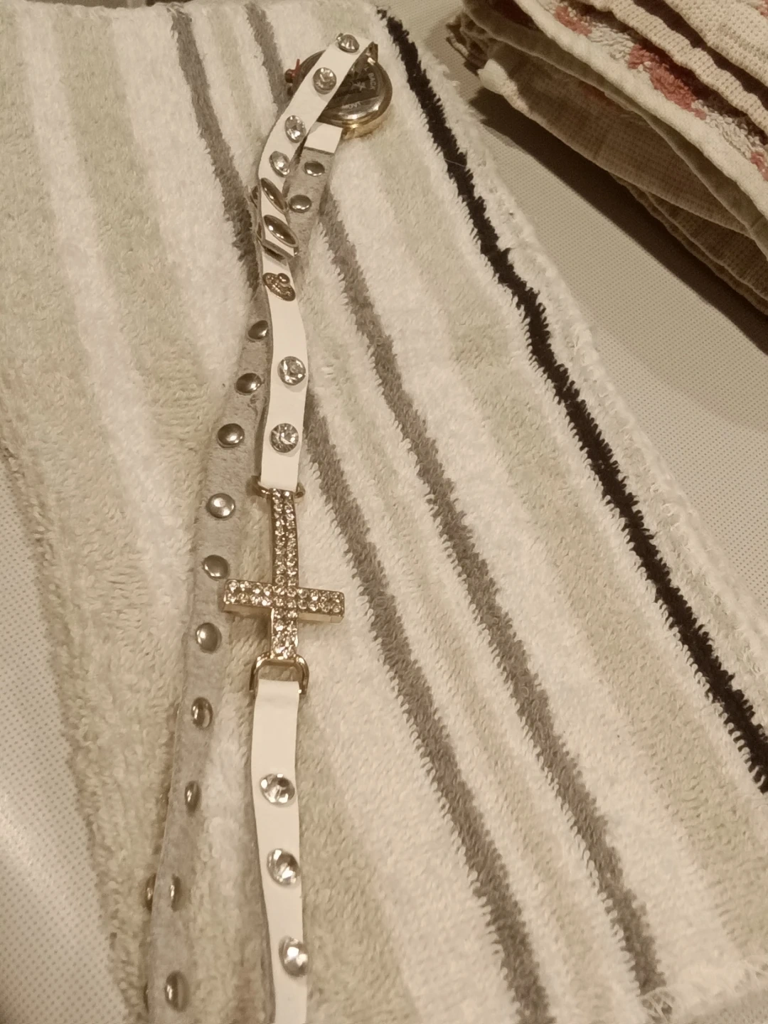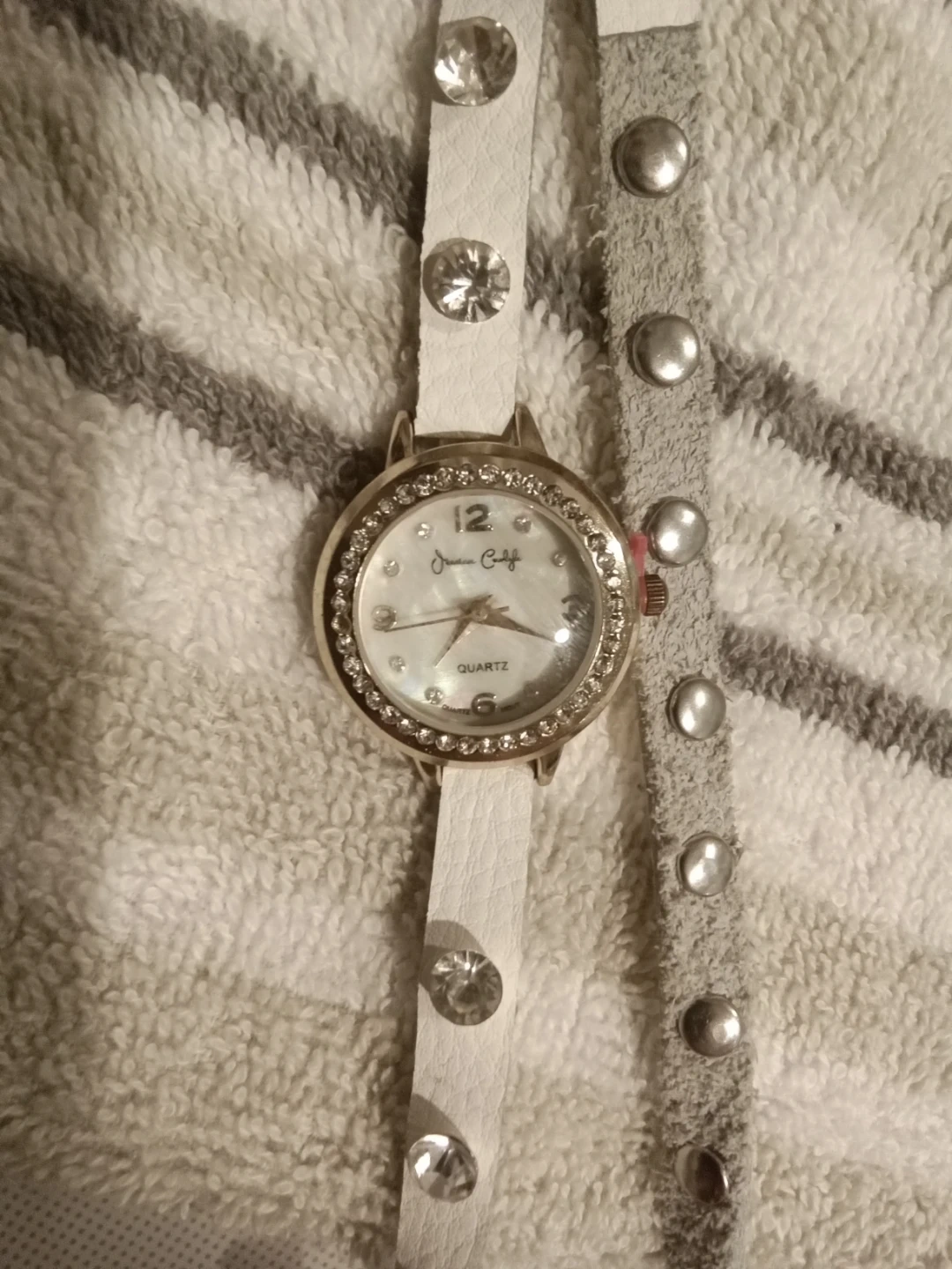 Selling a brand new never worn Jessica Carlyle watch with a white wrap around . It has a cross charm and decorative studs on the strap. The watch face is surrounded by small rhinestones.