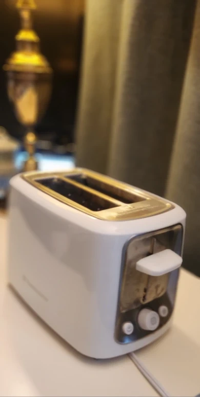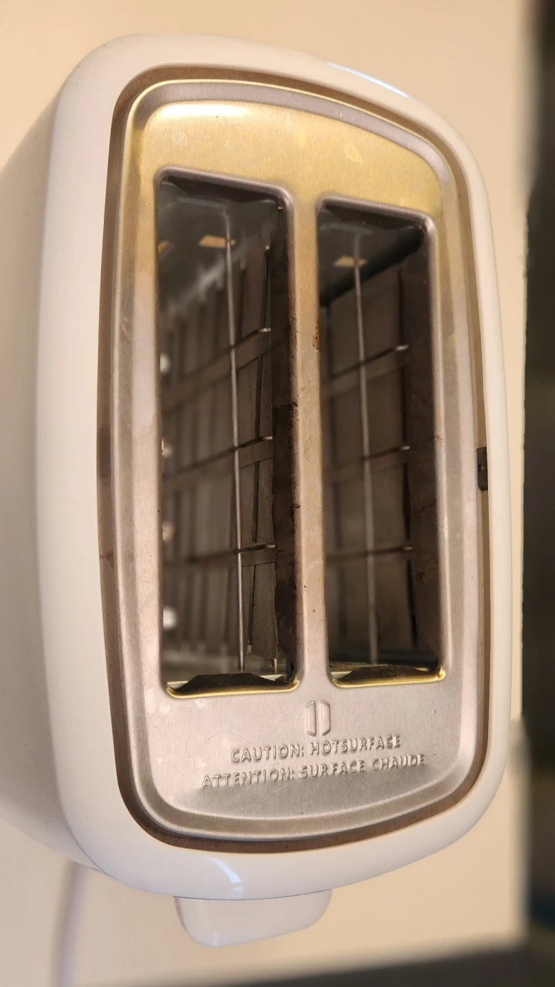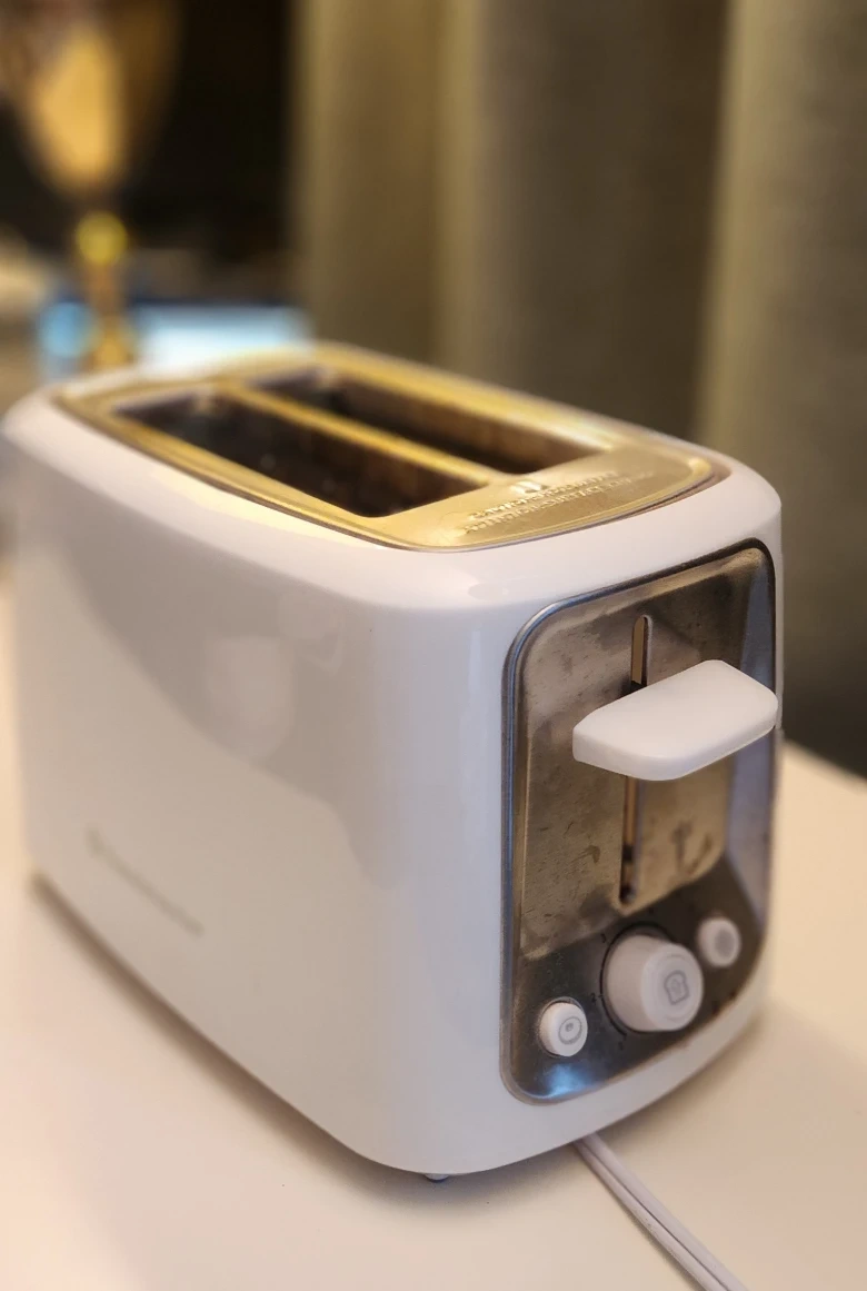 Selling a Toastmaster toaster in white. It's a two-slice toaster and in good condition. It has a caution label for hot surfaces.