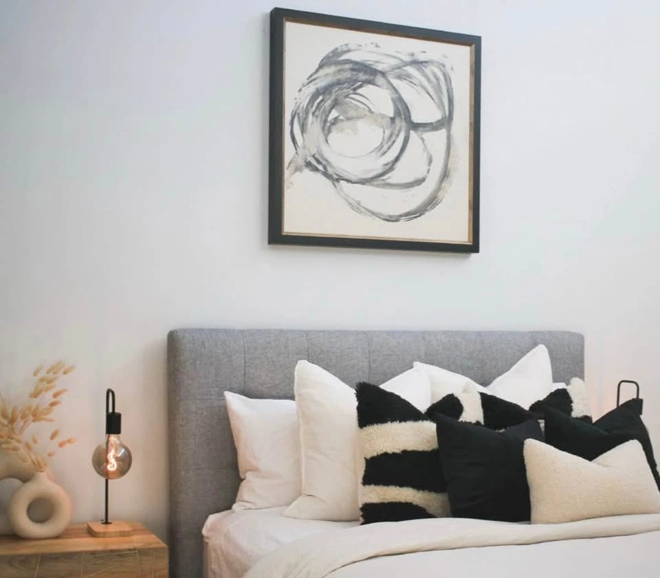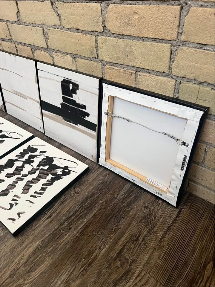 New, beautiful condition, ready to hang custom art canvases. Chic black border, high quality bound. Black, white, taupe colour scheme. Easy and complimentary of each other. Great for a hallway or bathroom or bedroom or around the house for consistency. Compliment larger pieces in my other listing, last couple pictures. Inquire via message if interested. Retail Price Approx $300 + Measurements: 12” x 12” x 0.75”. Moving Sale - See profile for other listings