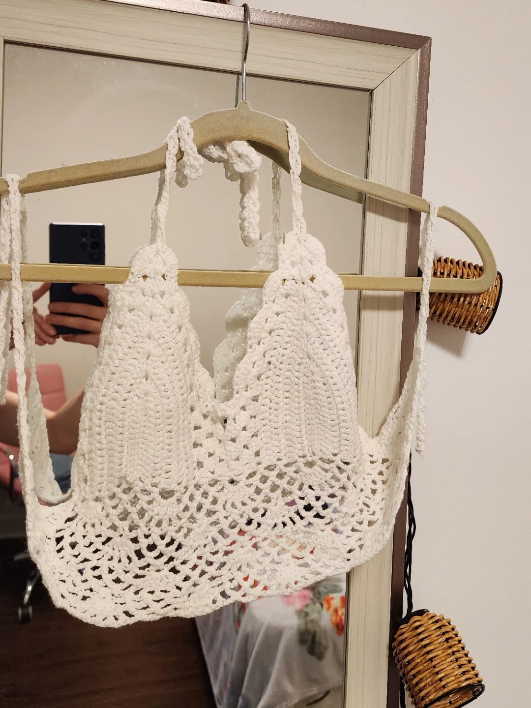 Selling a cute, handmade crochet halter top! It's a beautiful white color and perfect for summer. The material is soft and comfortable, making it ideal for warm weather. It's in great condition and ready for a new owner!