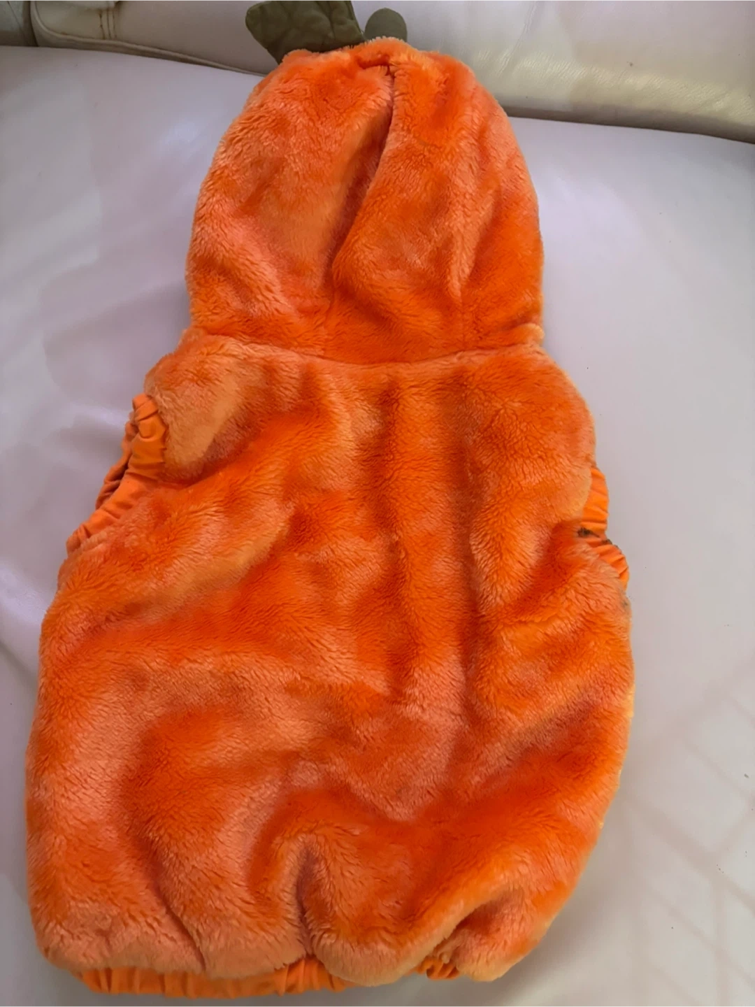 A cute pumpkin costume for your little one! It's in great condition and perfect for Halloween or dress-up. The costume is soft and fuzzy, making it comfy for your baby to wear