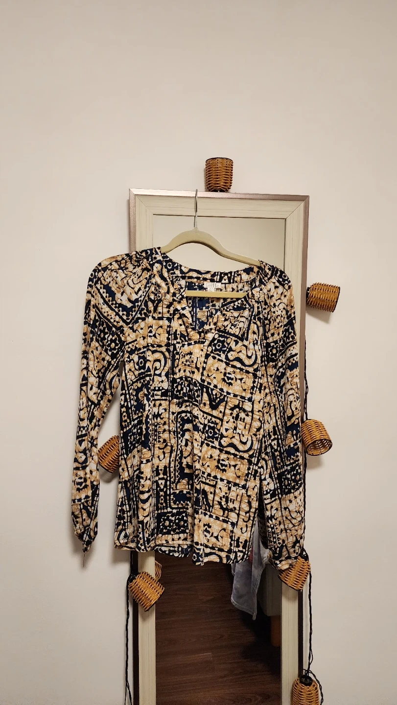 This is a women's long sleeve blouse by the brand SAITE. It features a unique pattern in tan and navy blue. Perfect for adding a stylish touch to your wardrobe!