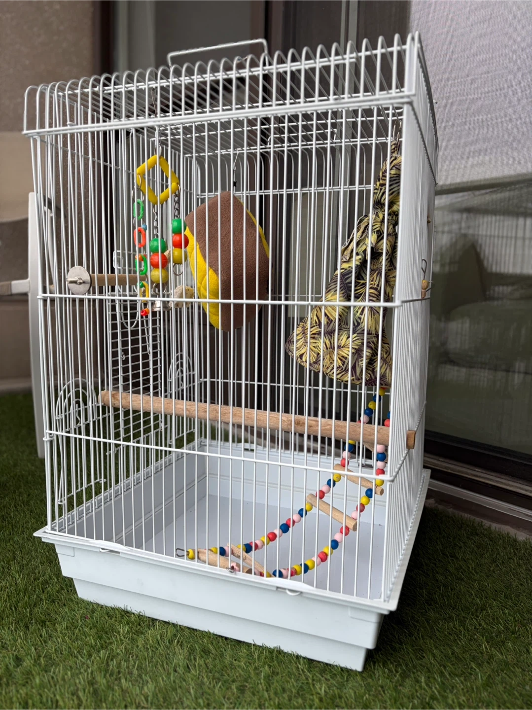 Selling a bird cage that's in great shape! It comes with some fun accessories to keep your feathered friend happy and entertained. Includes a cozy hanging hideaway and some colourful toys. Perfect for love birds, conures, cockatiels
