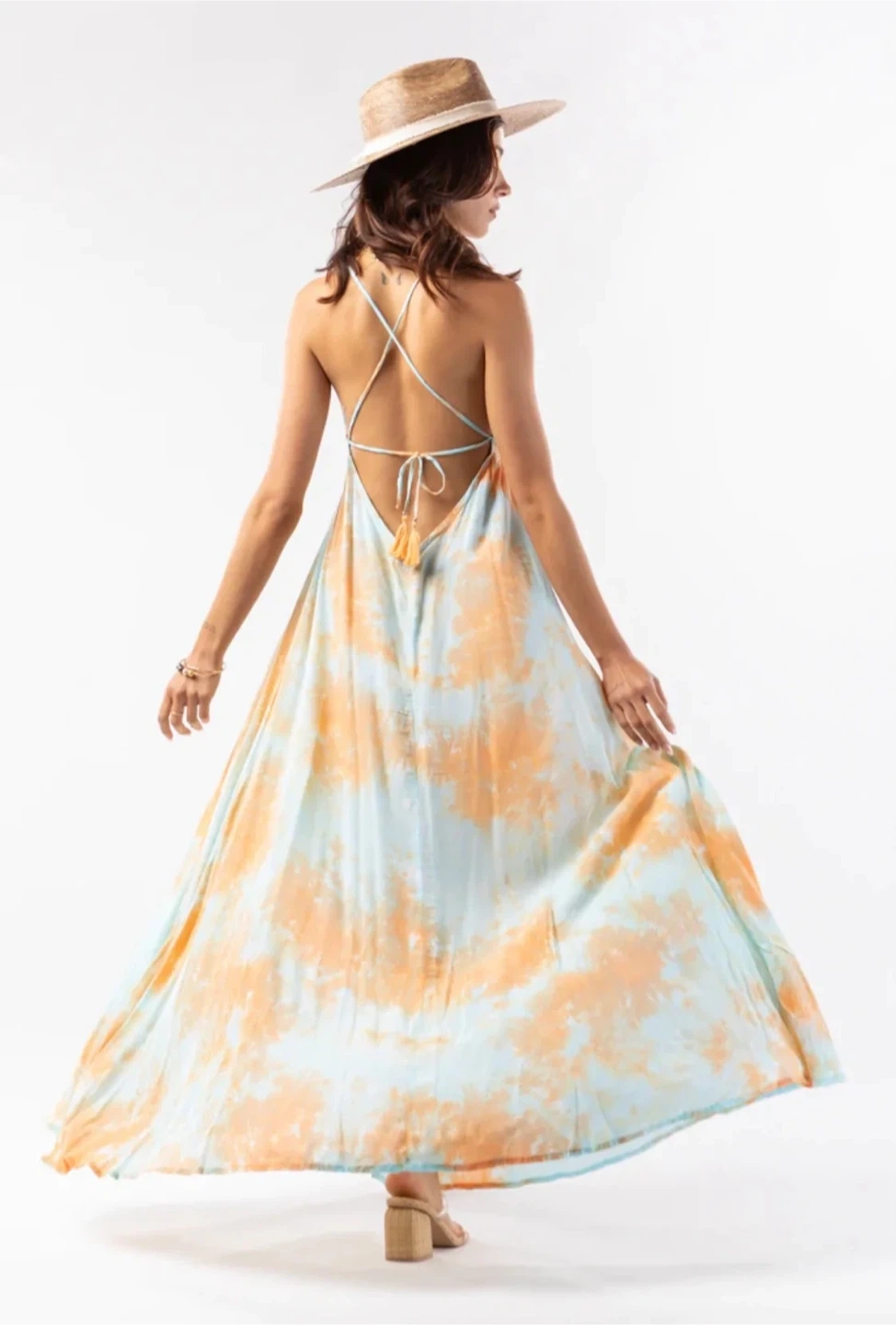 Selling a beautiful Revolve Tularosa Maxi Dress a unique tie-dye pattern, teal gold sunburst color. Size Small.