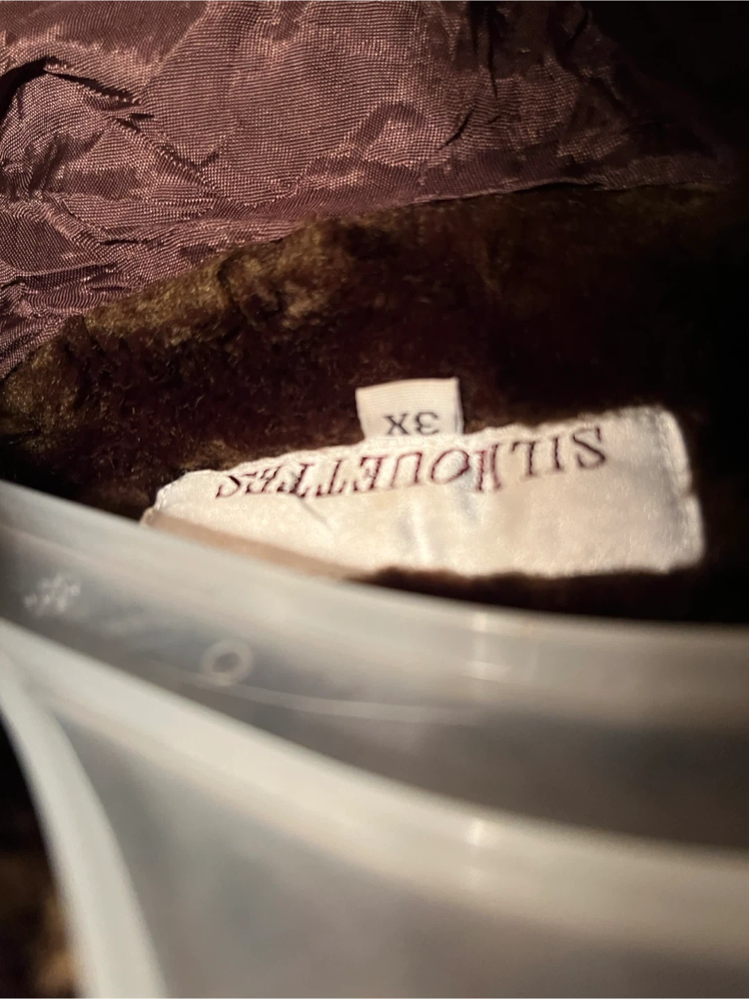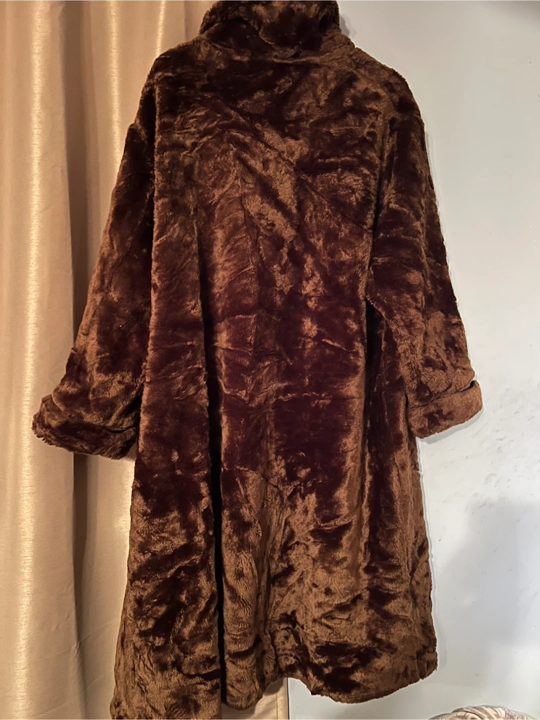 Here's a cozy Silhouettes faux fur coat in size 3X! It's a beautiful brown colour and perfect for keeping warm on chilly days. $25.00
