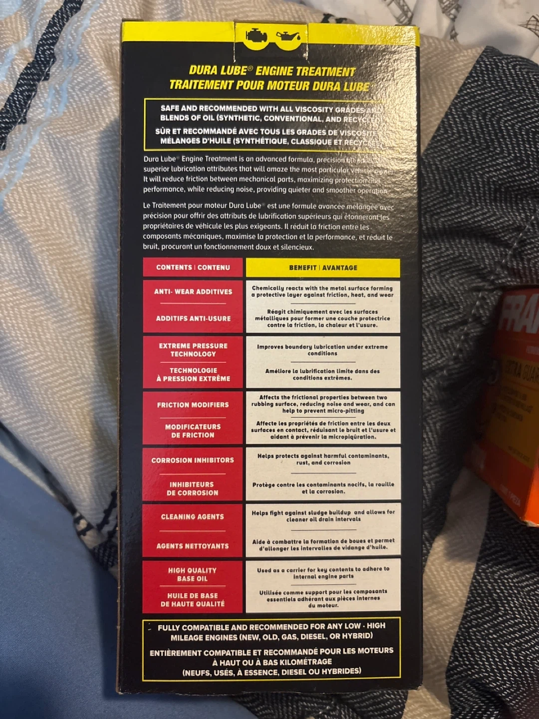 Selling a bottle of Dura Lube Engine Treatment. It helps the engine run cooler and quieter. It's formulated to treat the engine, not just the oil. It also helps extend fuel economy and oil life. The bottle contains 946 mL (32 fl oz) 1 US quart