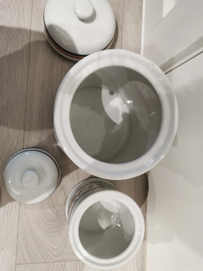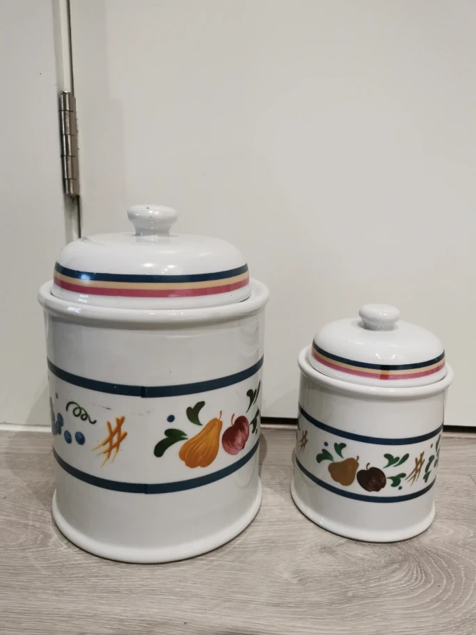 Here's a cute ceramic kitchen canister set! It features a charming fruit design and would be perfect for adding a touch of whimsy to your kitchen decor. The set includes two canisters of different sizes, both with lids. Selling as a pair.
