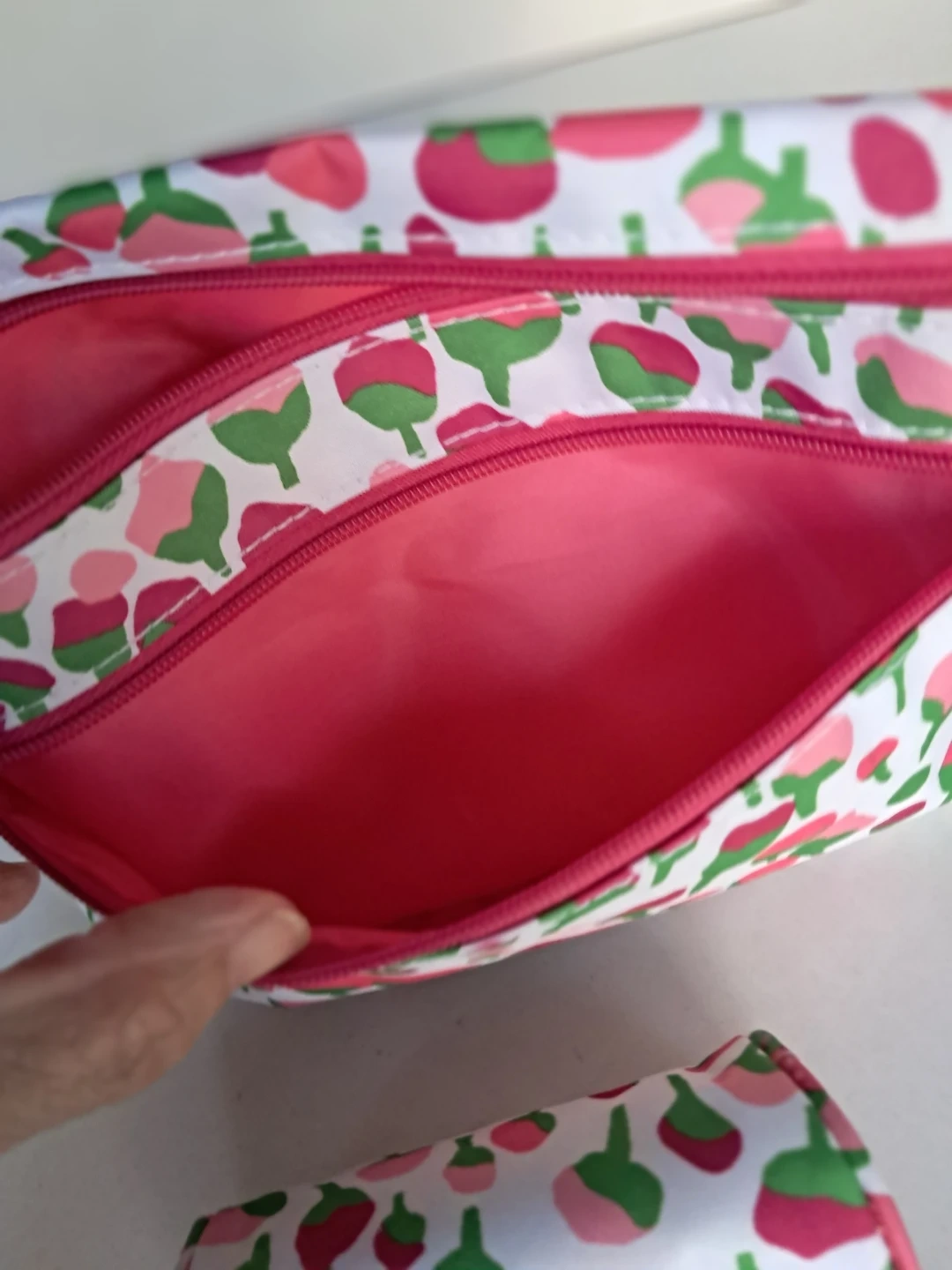 Selling a cute Clinique cosmetic bag set! The set includes two bags with a fun floral pattern in pink, green, and white. Perfect for keeping your makeup organized at home or while travelling