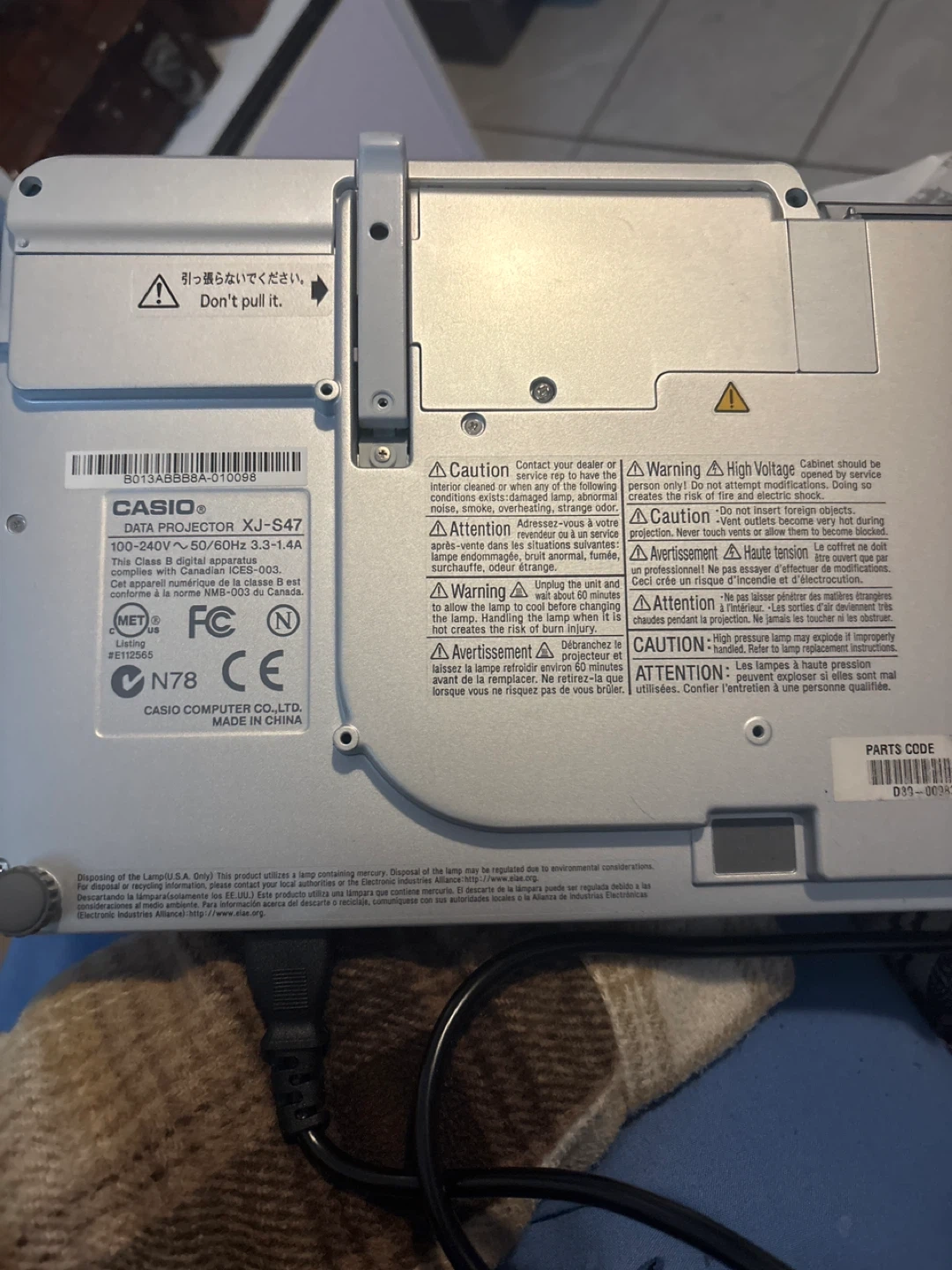 Selling a Casio Data Projector, model XJ-S47. It operates at 100-240V ~ 50/60Hz, 3.3-1.4A. This is a Class B digital apparatus that conforms to ICES-003 and NMB-003 standards in Canada