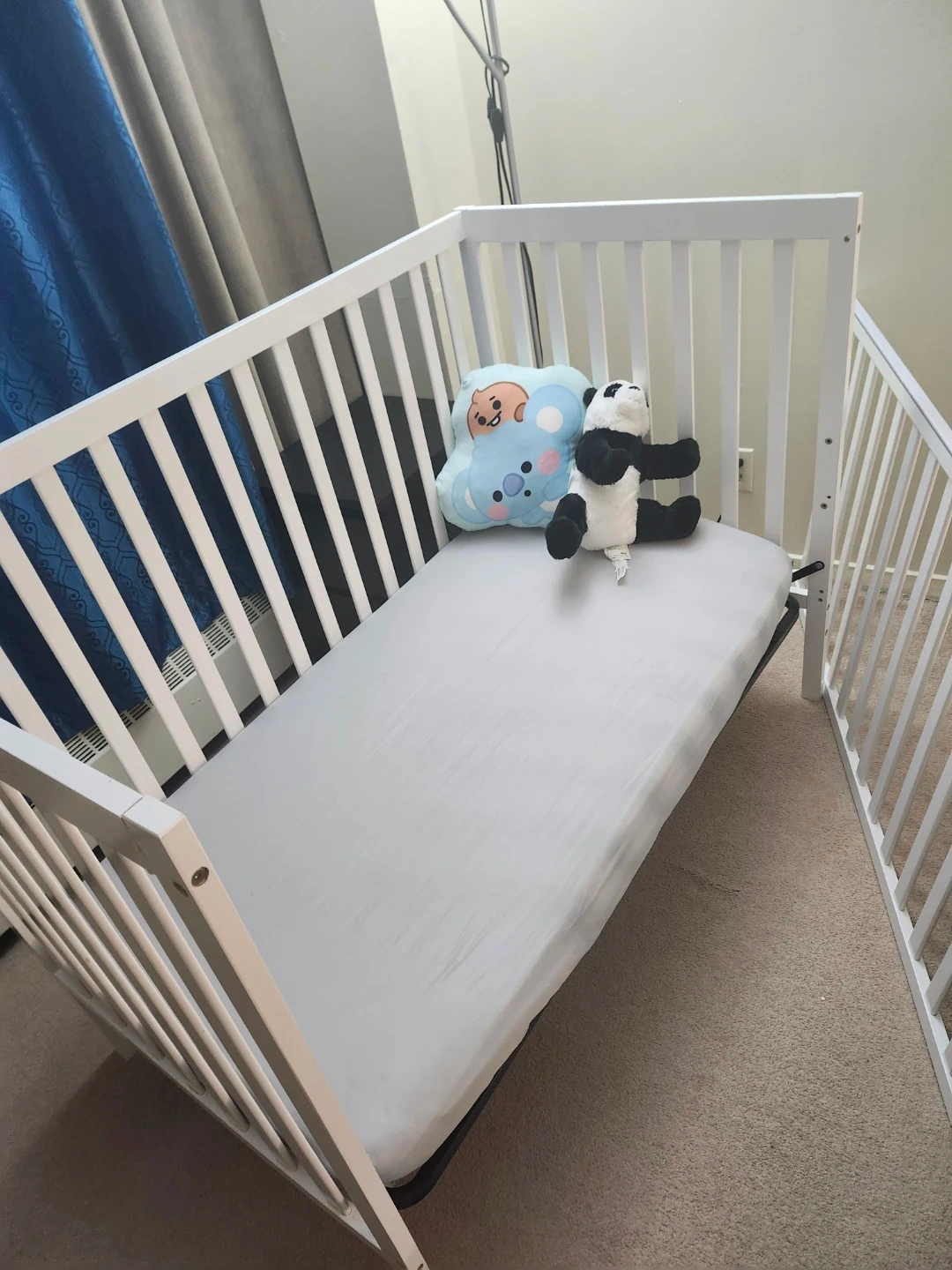 Selling a gently used baby crib. It's in great condition and ready for a new little one. The crib is white and has a simple, classic design that would fit well in any nursery