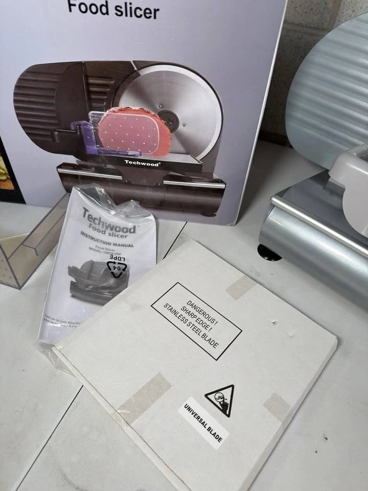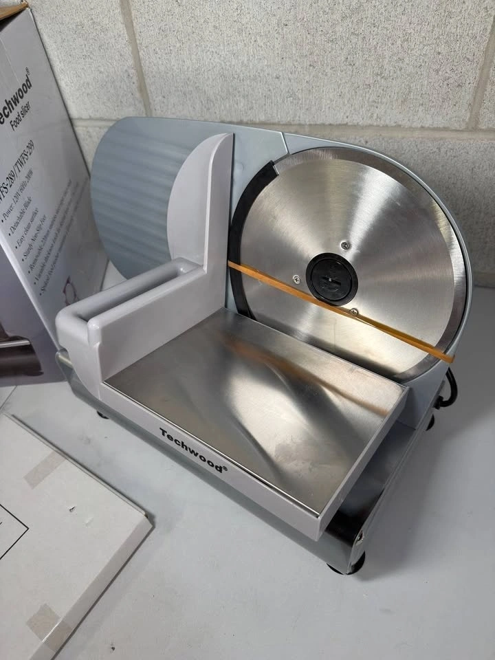 ‼️ All sales are final – no returns 💵 Cash only 🚚 Free Delivery In GTA over 50$ Condition: NEW Slice meats, cheeses, bread, and produce with this compact 17 × 9 × 9 cm Techwood food slicer. The adjustable dial lets you cut from 1 mm to 15 mm, while the 200W motor and 9" stainless-steel blade deliver smooth, consistent results. Features non-slip feet, a safety guard, and a removable blade for easy cleaning.