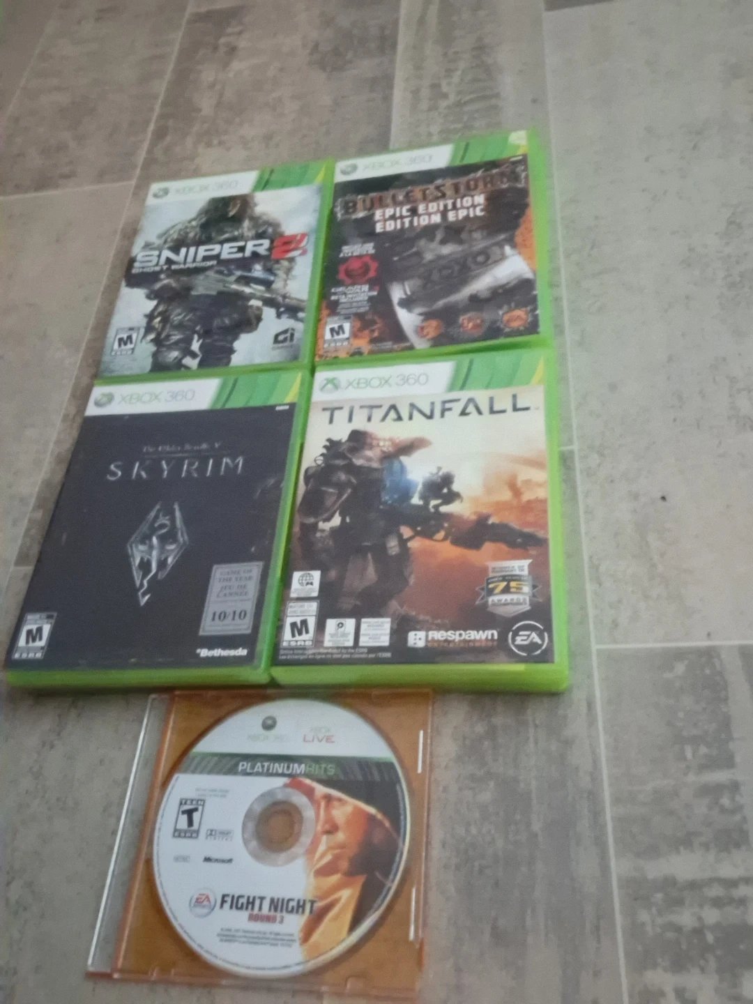 Selling Xbox 360 games! Includes Sniper 2: Ghost Warrior, Bulletstorm Epic Edition, The Elder Scrolls V: Skyrim, Titanfall, and Fight Night Round 3 Platinum Hits! All games are in good condition and ready for a new player to enjoy!