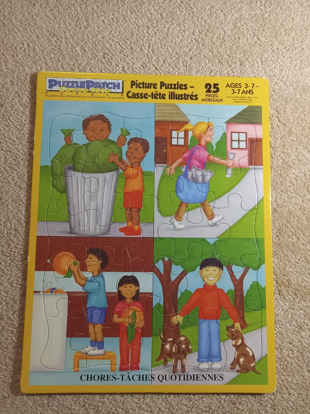 Selling a PuzzlePatch picture puzzle set! It includes 25 pieces and is suitable for ages 3-7 years. The 4 puzzles feature colourful illustrations and is in English and French. Great for kids!
