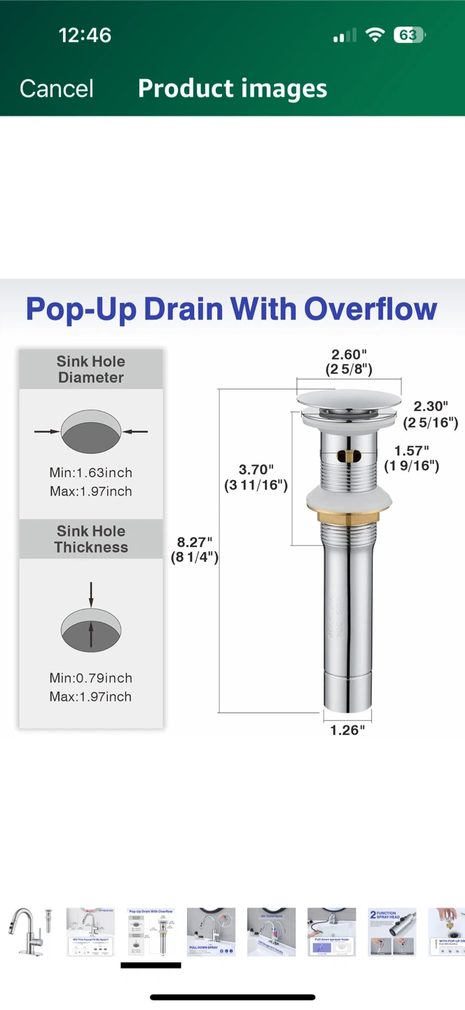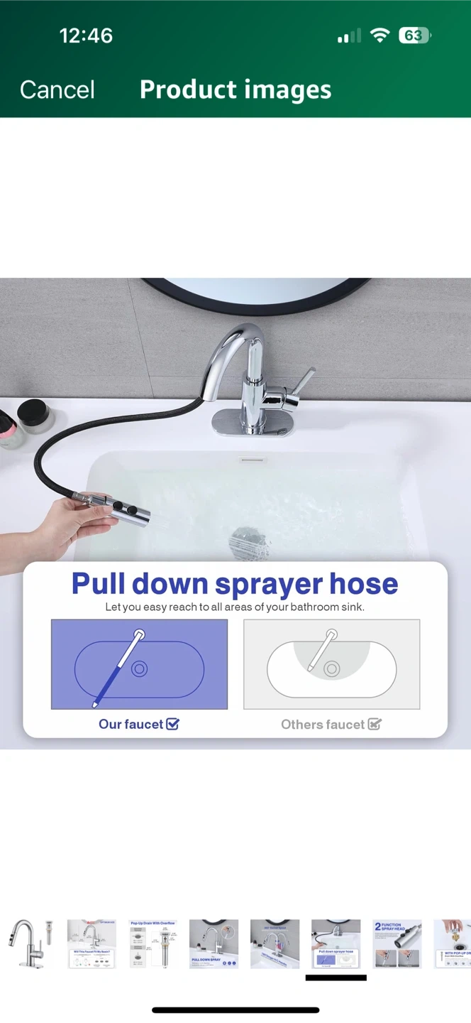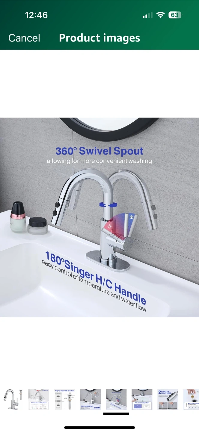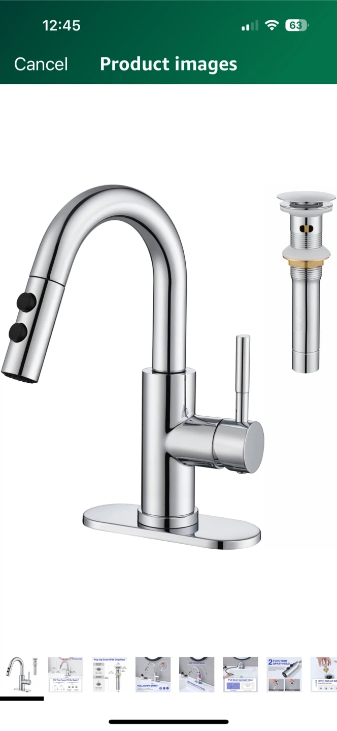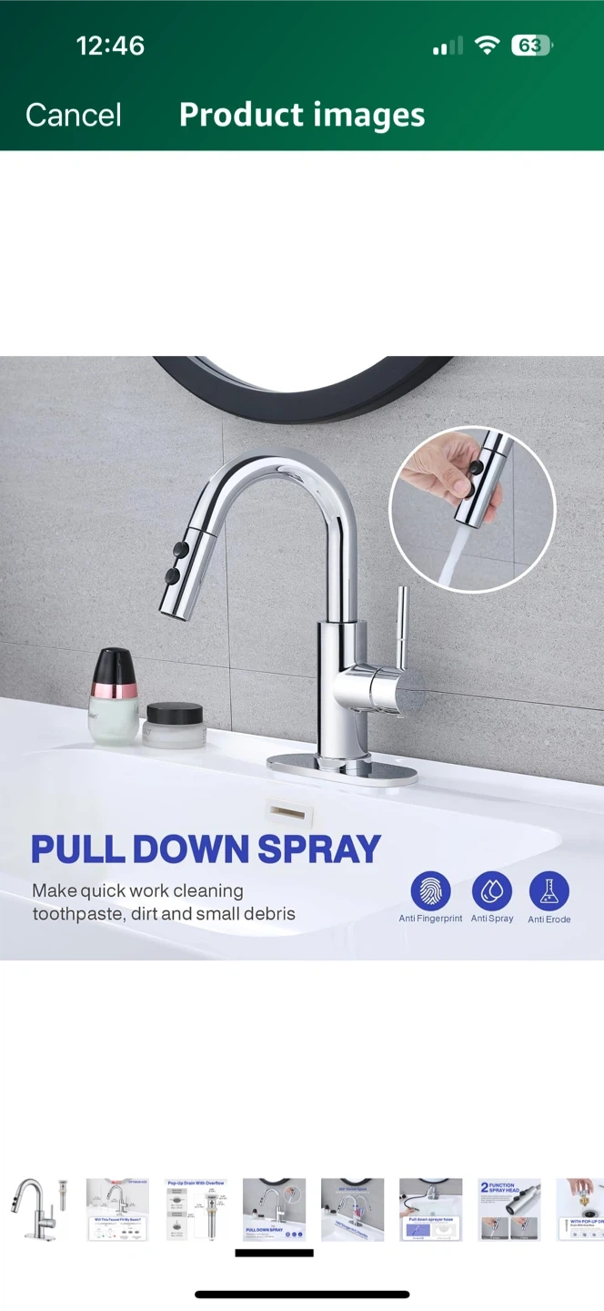 This kitchen faucet features a 360° swivel spout and a 180° single handle for easy control of temperature and water flow. It also has a pull-down sprayer to make quick work of cleaning toothpaste, dirt, and small debris. The faucet is designed with anti-fingerprint and anti-spray features, and it's made to resist erosion. The optimum size ensures it will fit your basin, with detailed measurements provided in the images