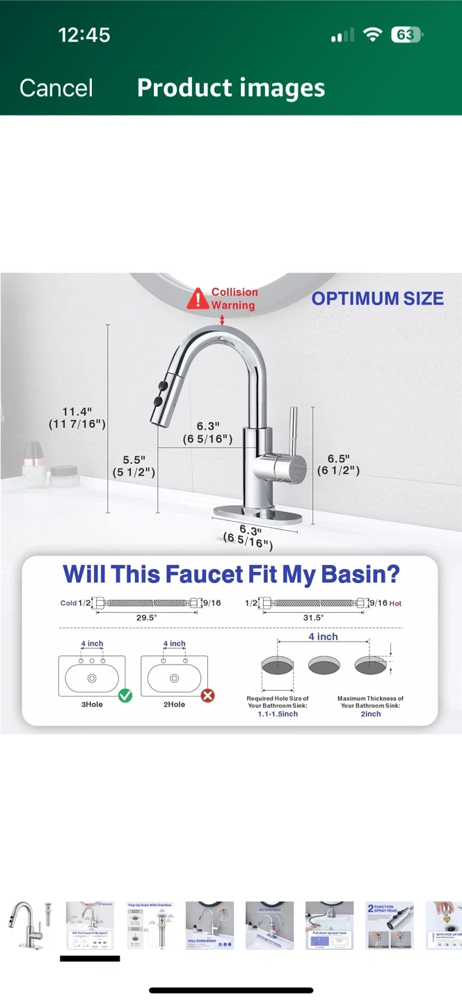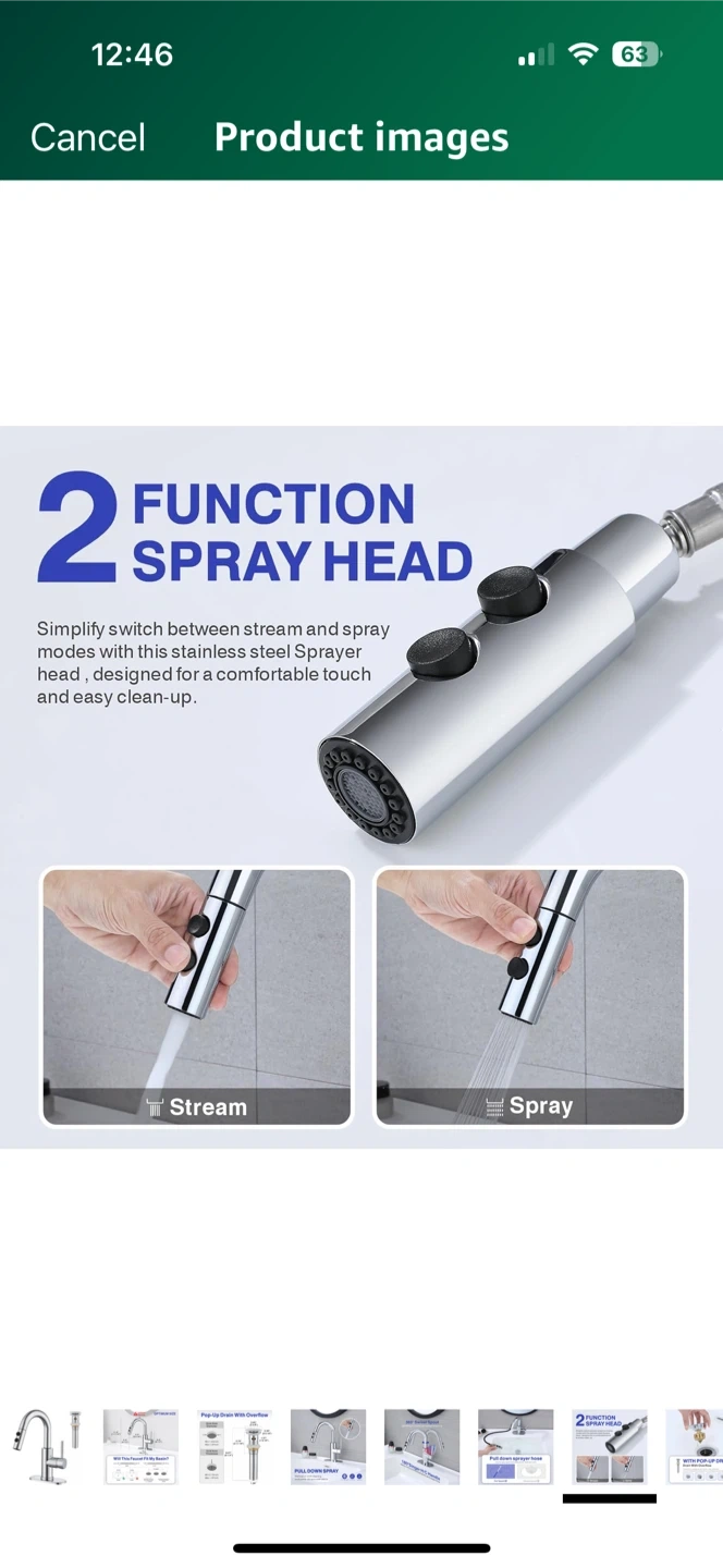 This kitchen faucet features a 360° swivel spout and a 180° single handle for easy control of temperature and water flow. It also has a pull-down sprayer to make quick work of cleaning toothpaste, dirt, and small debris. The faucet is designed with anti-fingerprint and anti-spray features, and it's made to resist erosion. The optimum size ensures it will fit your basin, with detailed measurements provided in the images