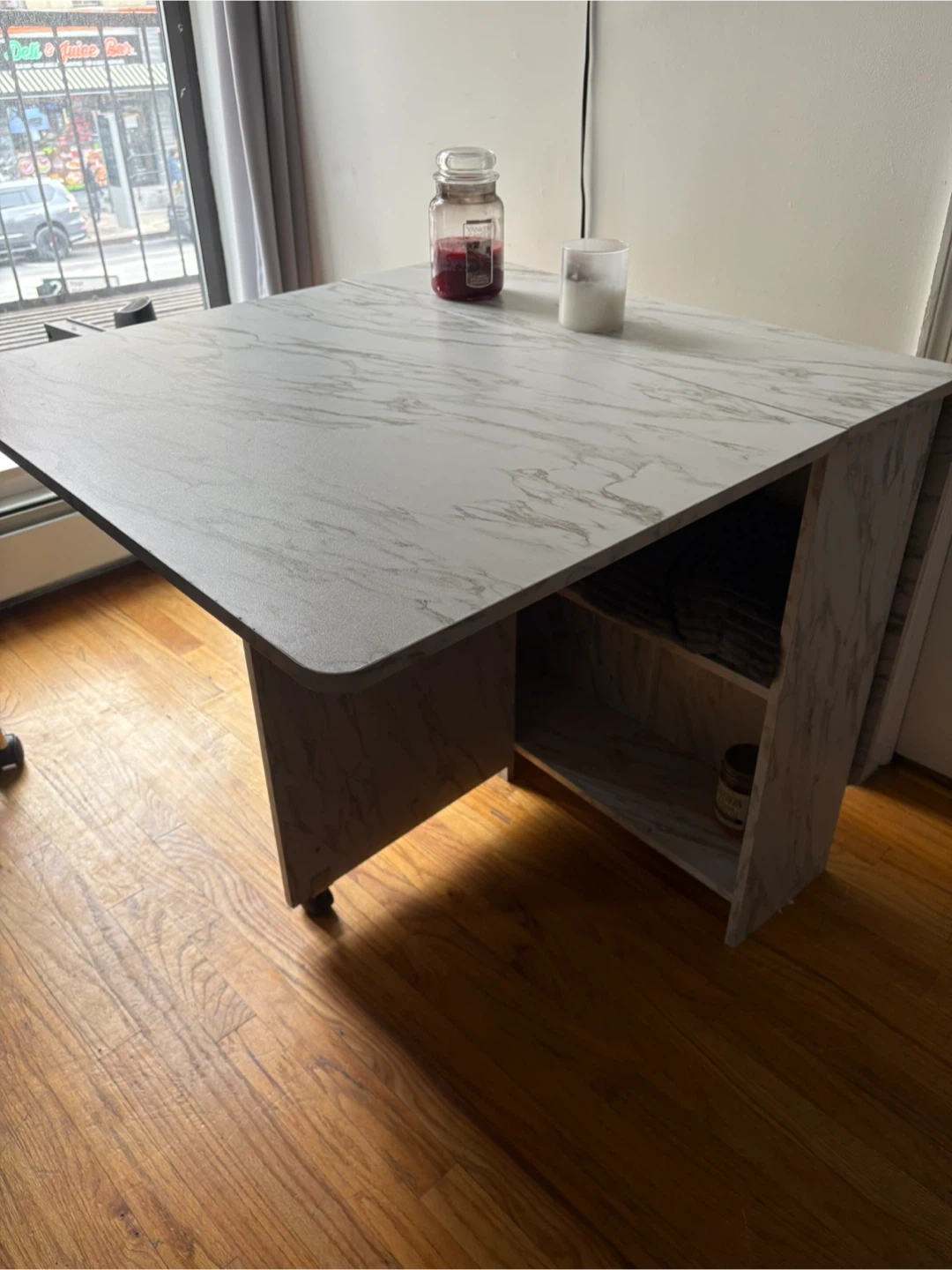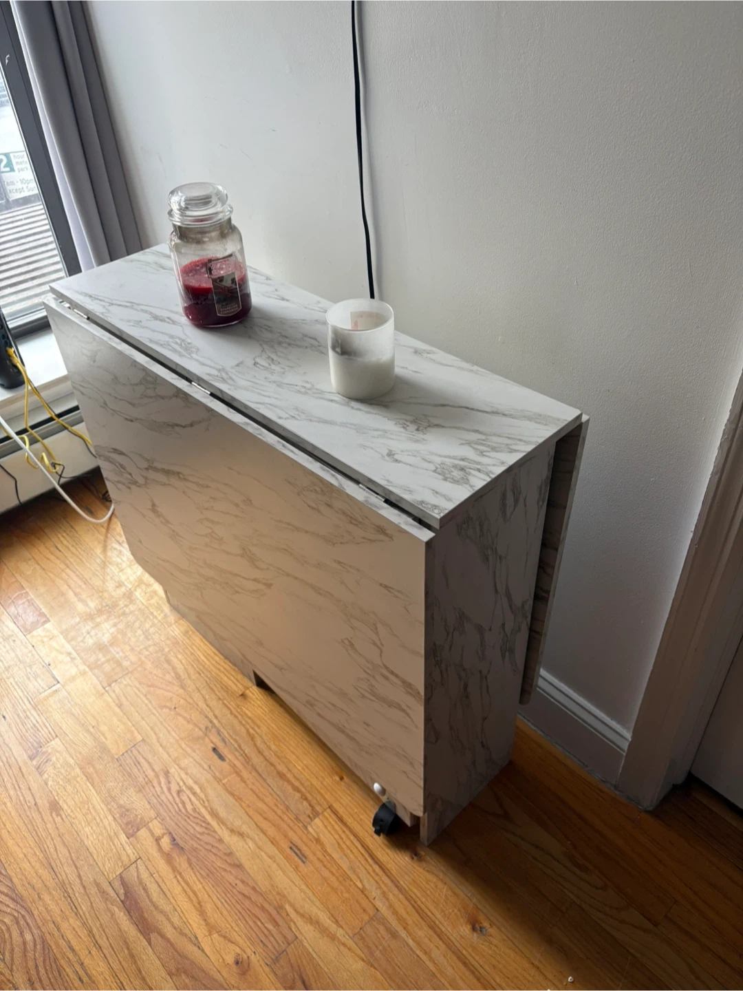 Selling a folding dining table with a marble-like finish! It's got wheels for easy moving and storage. Perfect for smaller spaces or when you need extra table space up to 6 seats