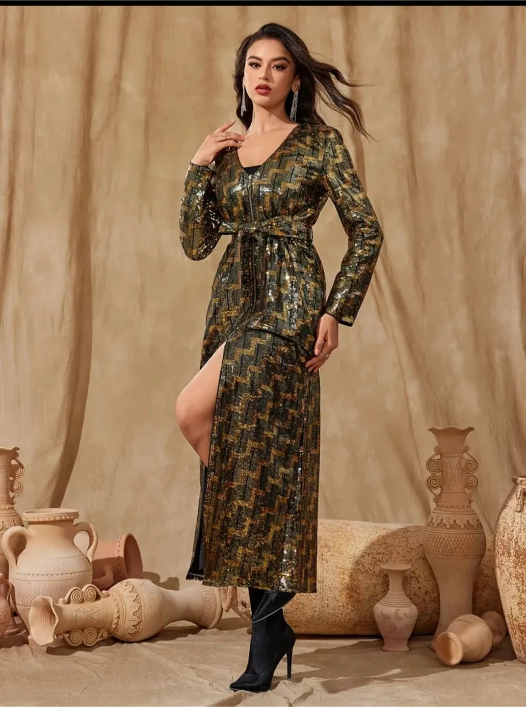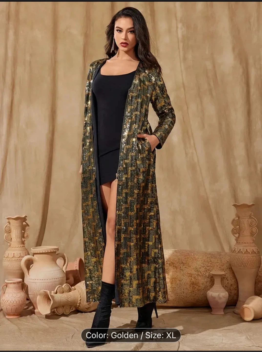 Selling a stylish golden sequin duster coat ! This eye-catching coat is perfect for adding a touch of glamour to any outfit. It features a longline silhouette and all-over sequin embellishments. Great for parties or special occasions!