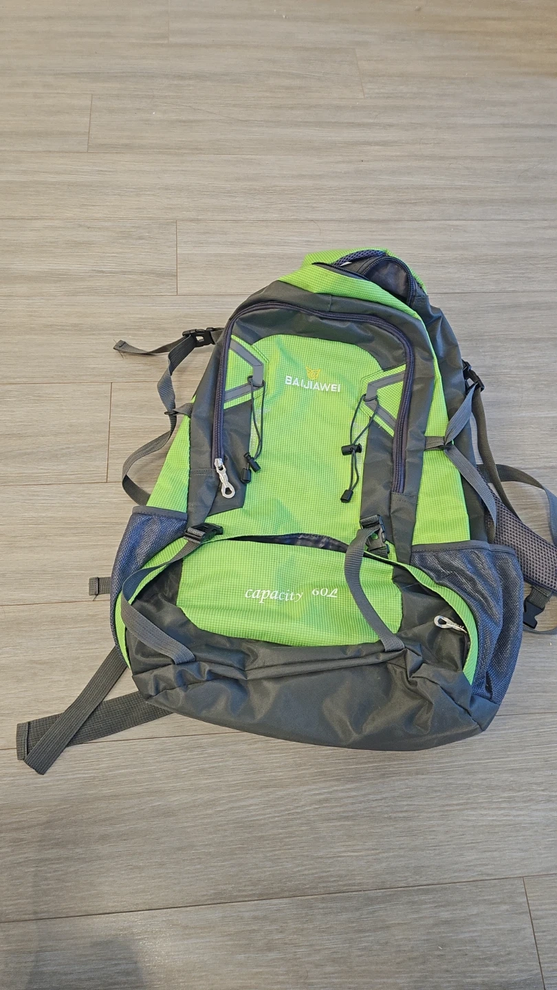 Selling a Baijiawei hiking backpack. It's green and grey and has a capacity of 60L. Perfect for your next outdoor adventure!