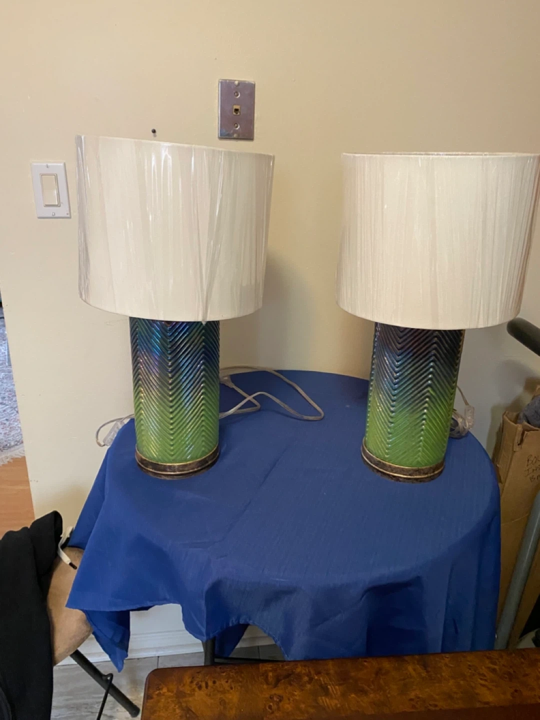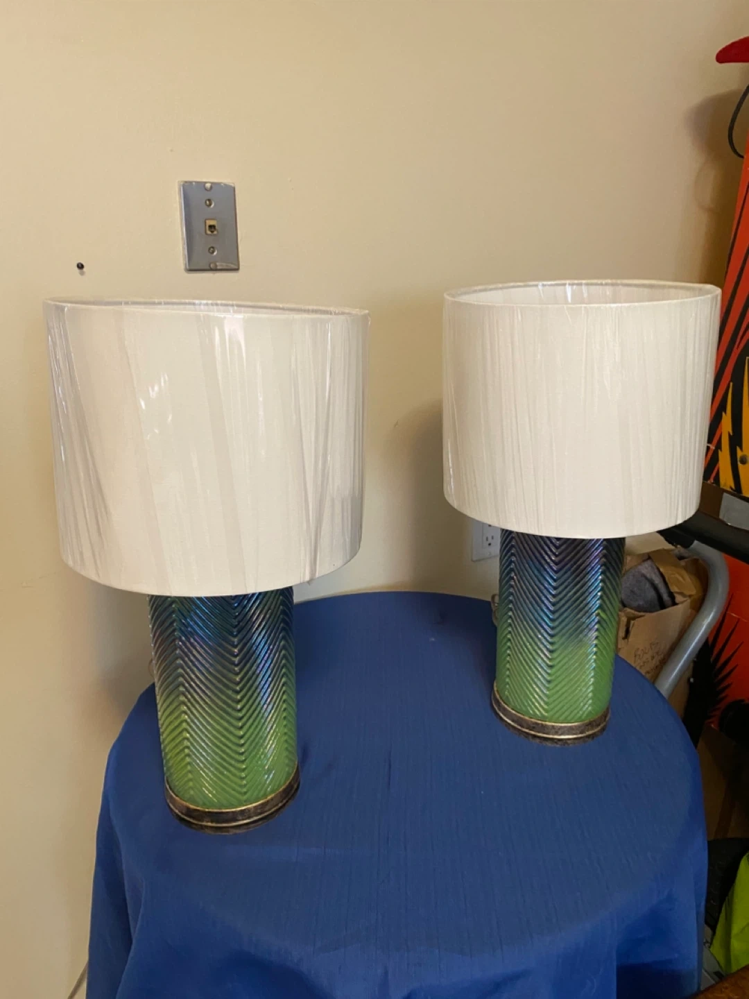 Selling a pair of stylish lamps featuring a unique green chevron pattern on the base. These lamps will add a touch of elegance to any room. They are in great condition and ready to brighten up your space! Plastic still on the lamp shades. Used in home staging. Non smoke, non pet like new.
