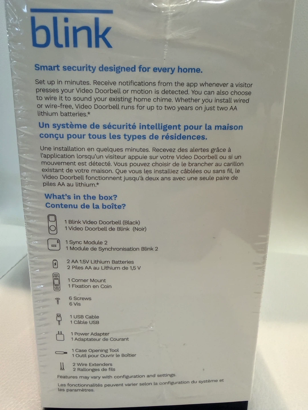 It's still in its original packaging. The box includes both the video doorbell and the sync module 2.