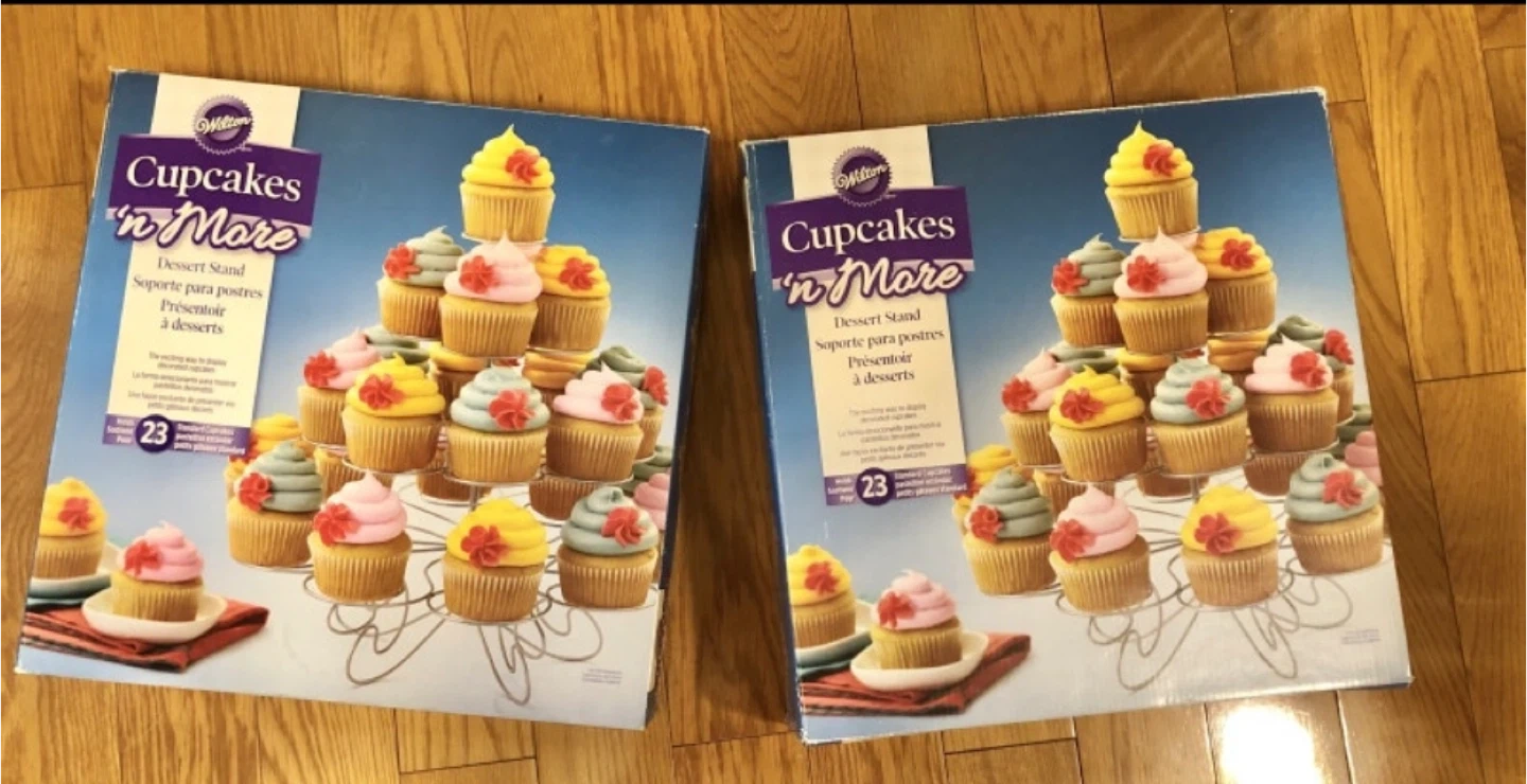 Selling two Wilton Cupcakes 'n More dessert stands. They are perfect for displaying your delicious cupcakes or other desserts! Each one can hold 23 standard cupcakes. Only used once. Great for parties or special occasions!