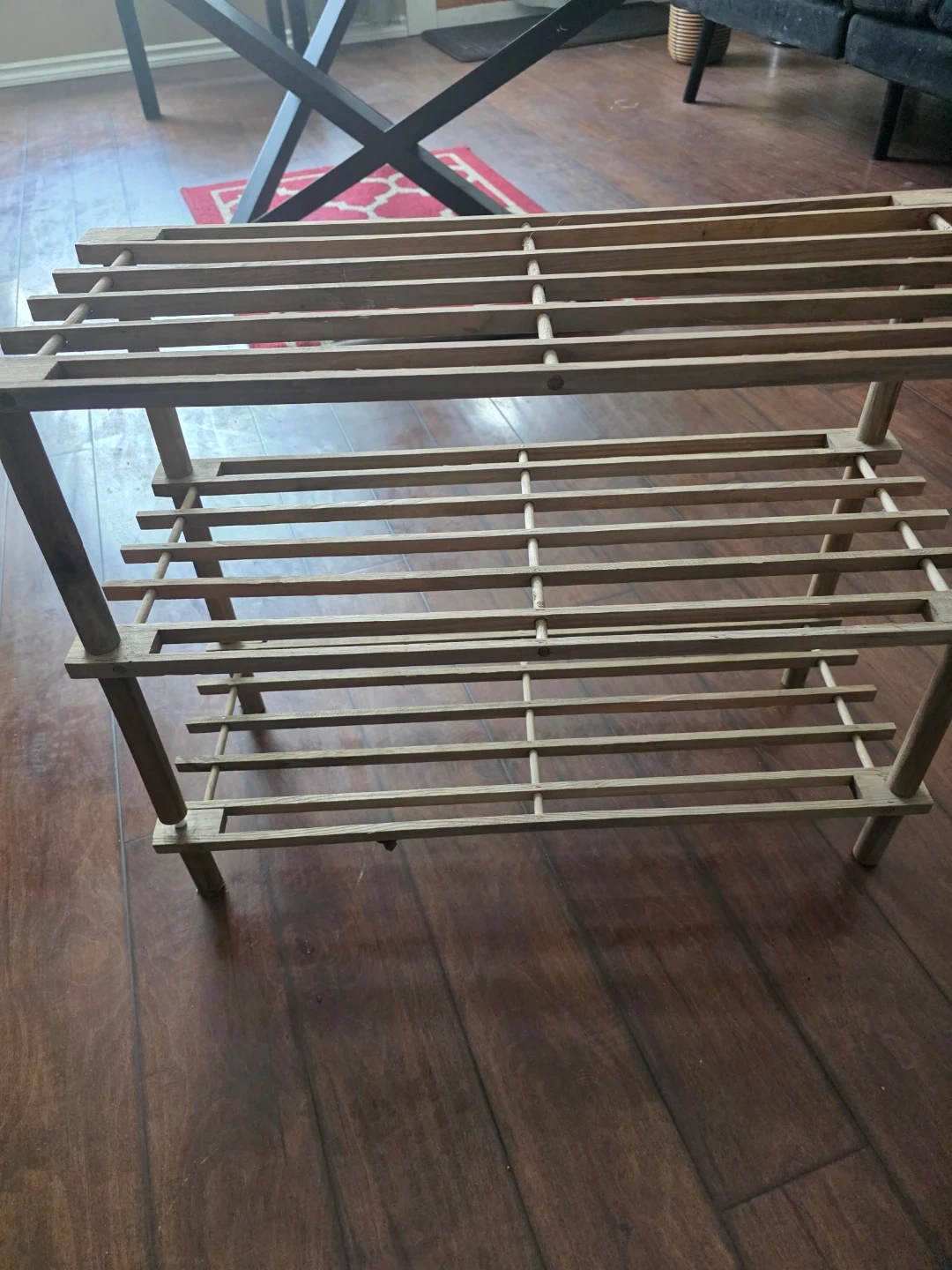 Selling a wooden shoe rack in good condition! It's perfect for keeping your entryway or closet organized. It has three shelves, offering plenty of space for your shoes. A simple and functional addition to any home!