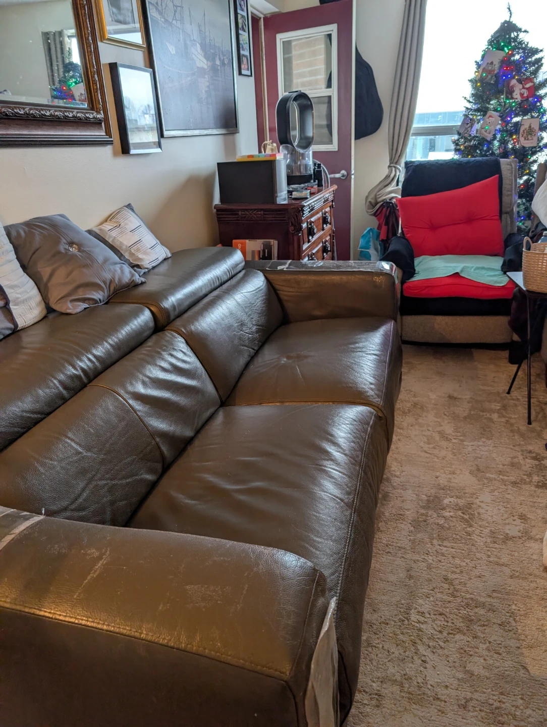 Selling a comfortable leather sofa. It's a great addition to any living room. The sofa has a classic design and is a dark grey colour. It has some signs of wear, but overall it's in good condition and ready for a new home!