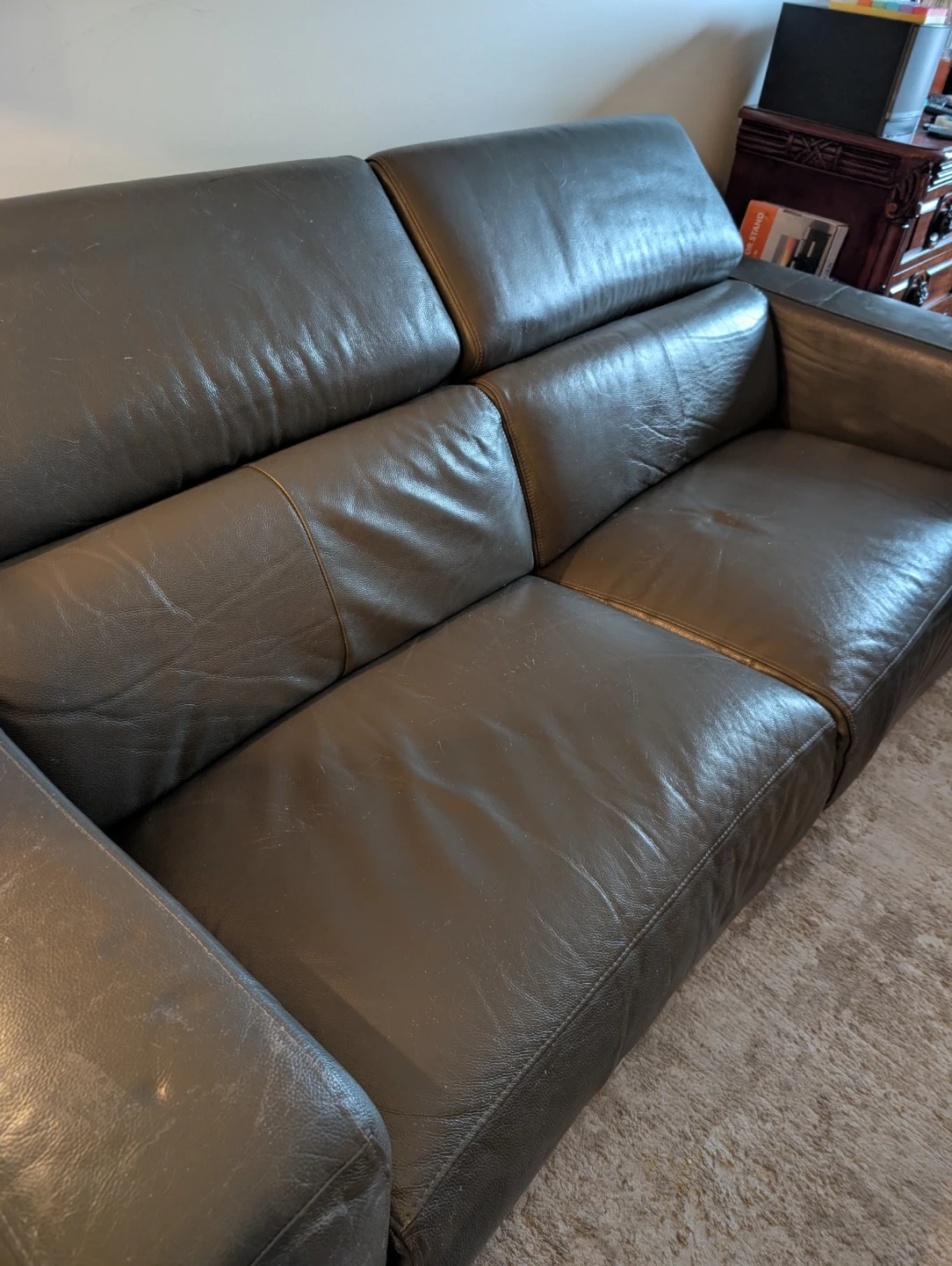 Selling a comfortable leather sofa. It's a great addition to any living room. The sofa has a classic design and is a dark grey colour. It has some signs of wear, but overall it's in good condition and ready for a new home!