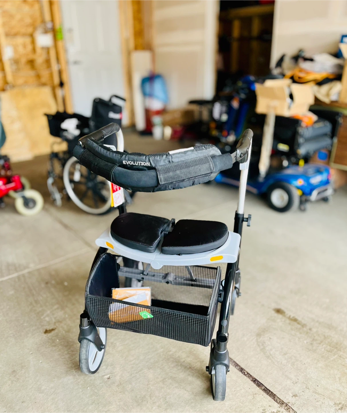 Selling an Evolution walker! It comes with a seat and basket, making it super convenient for errands or just getting around. It looks to be in great shape!